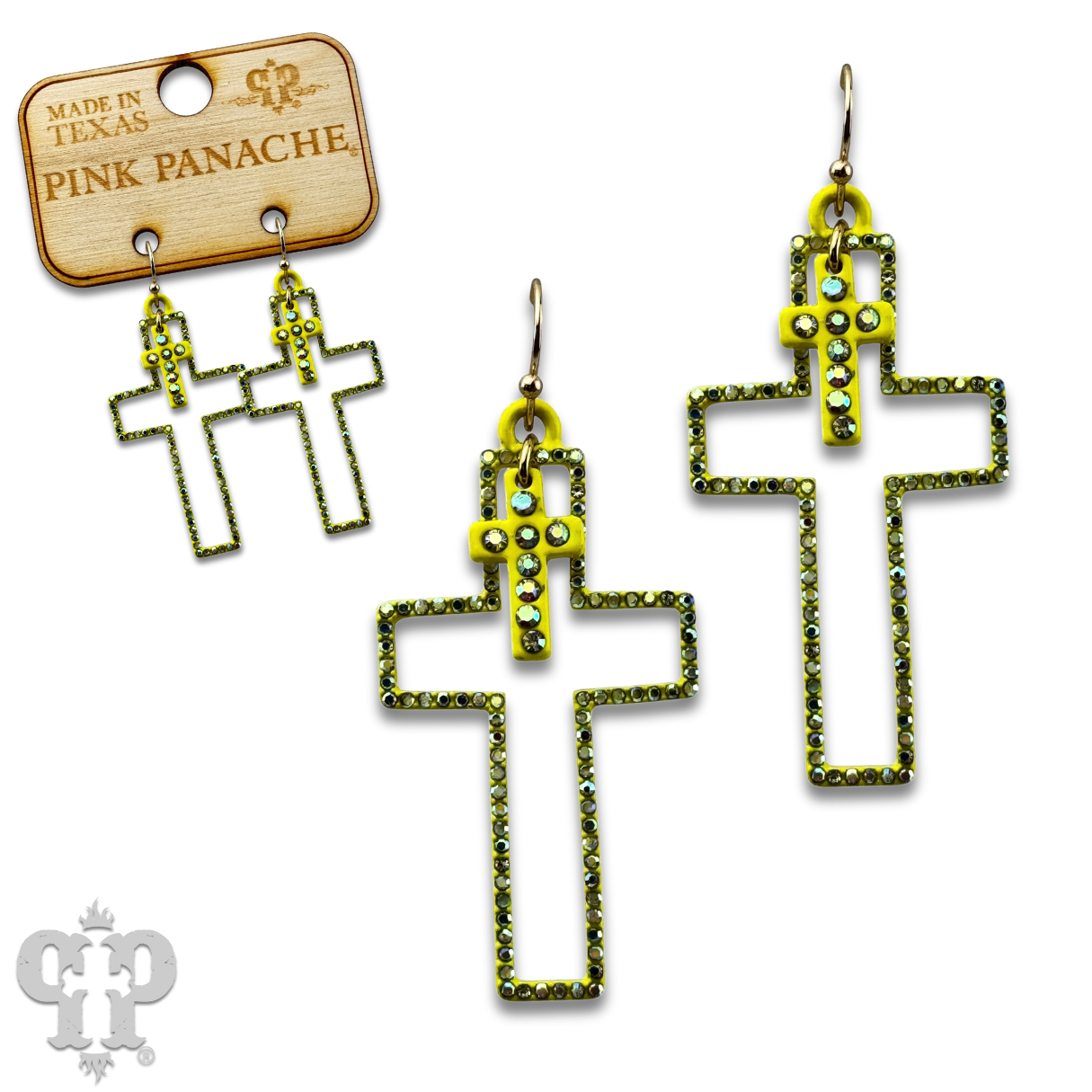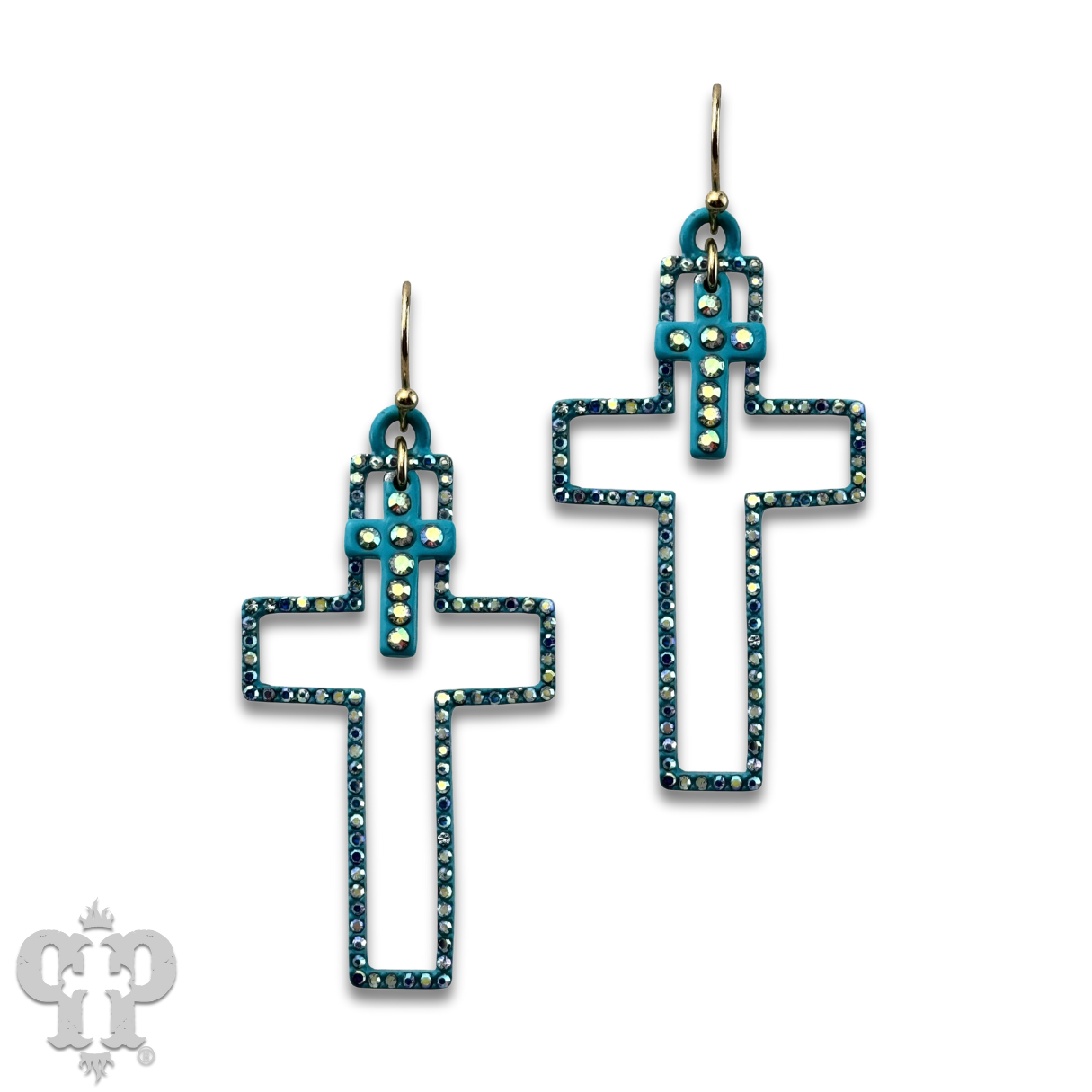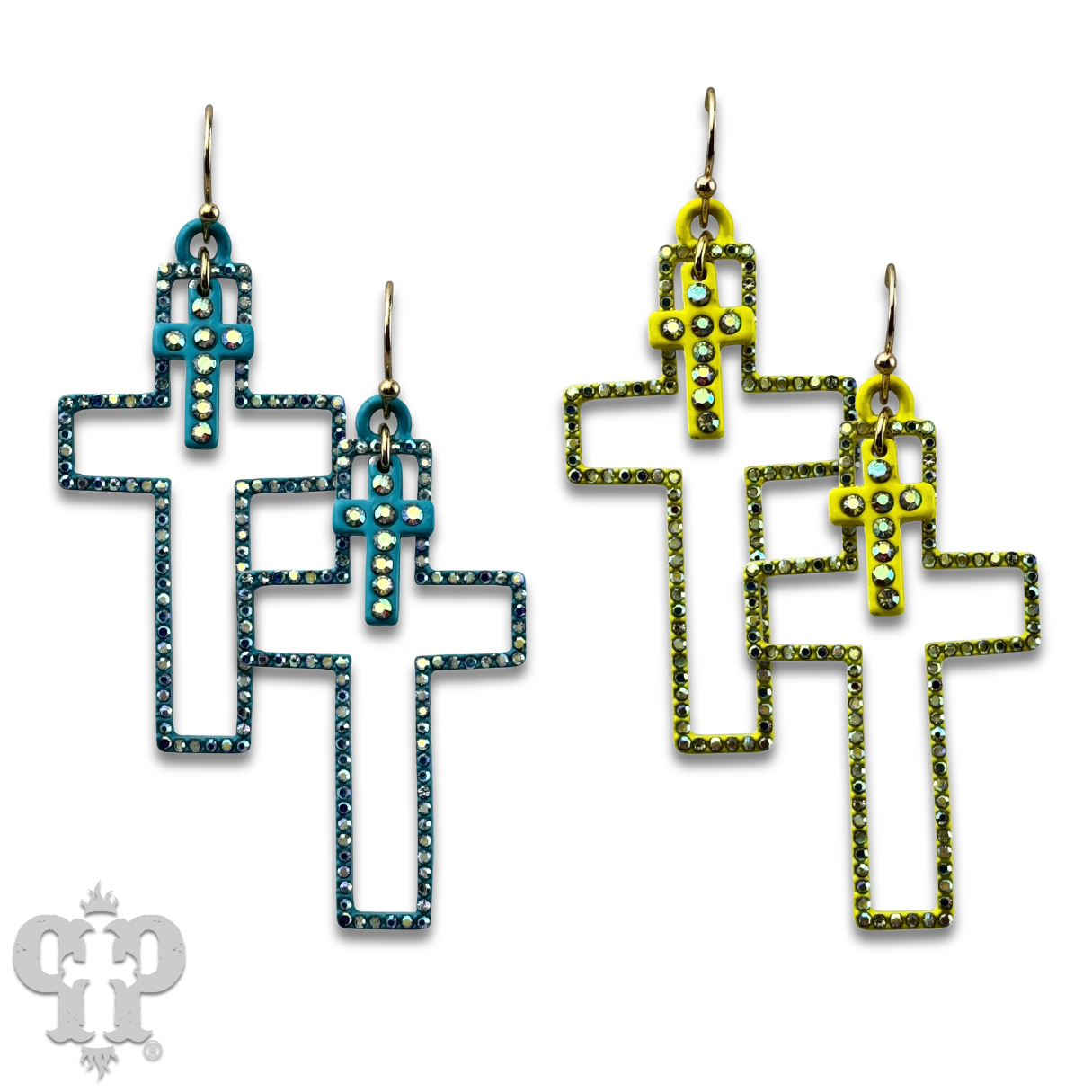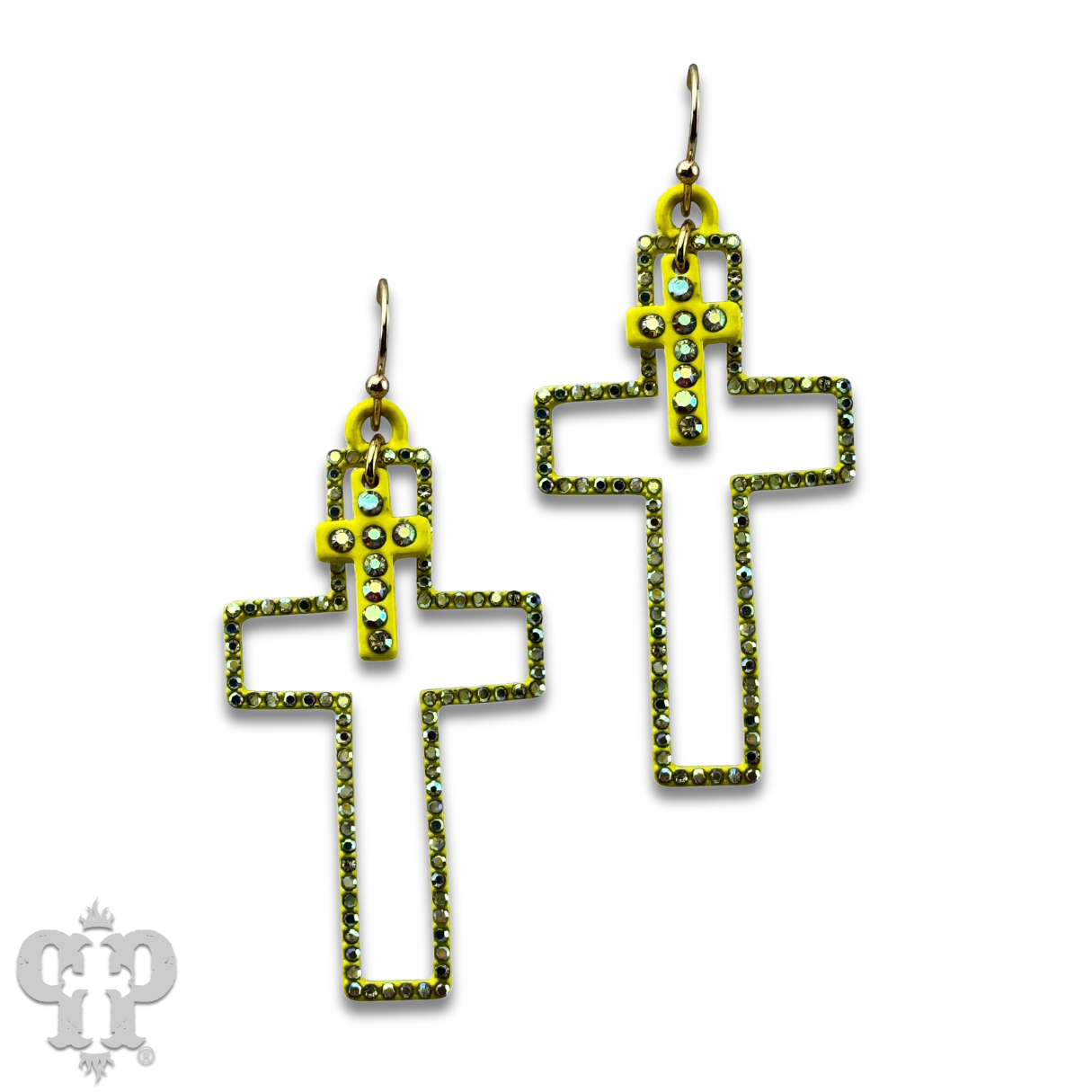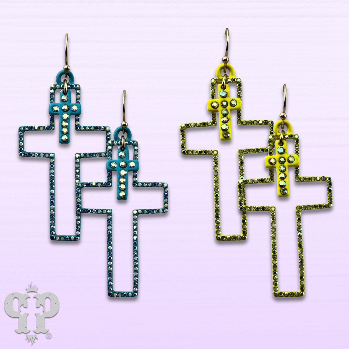 These earrings boast a pair of rhinestone crosses hanging gracefully from a sparkling Austrian crystal.