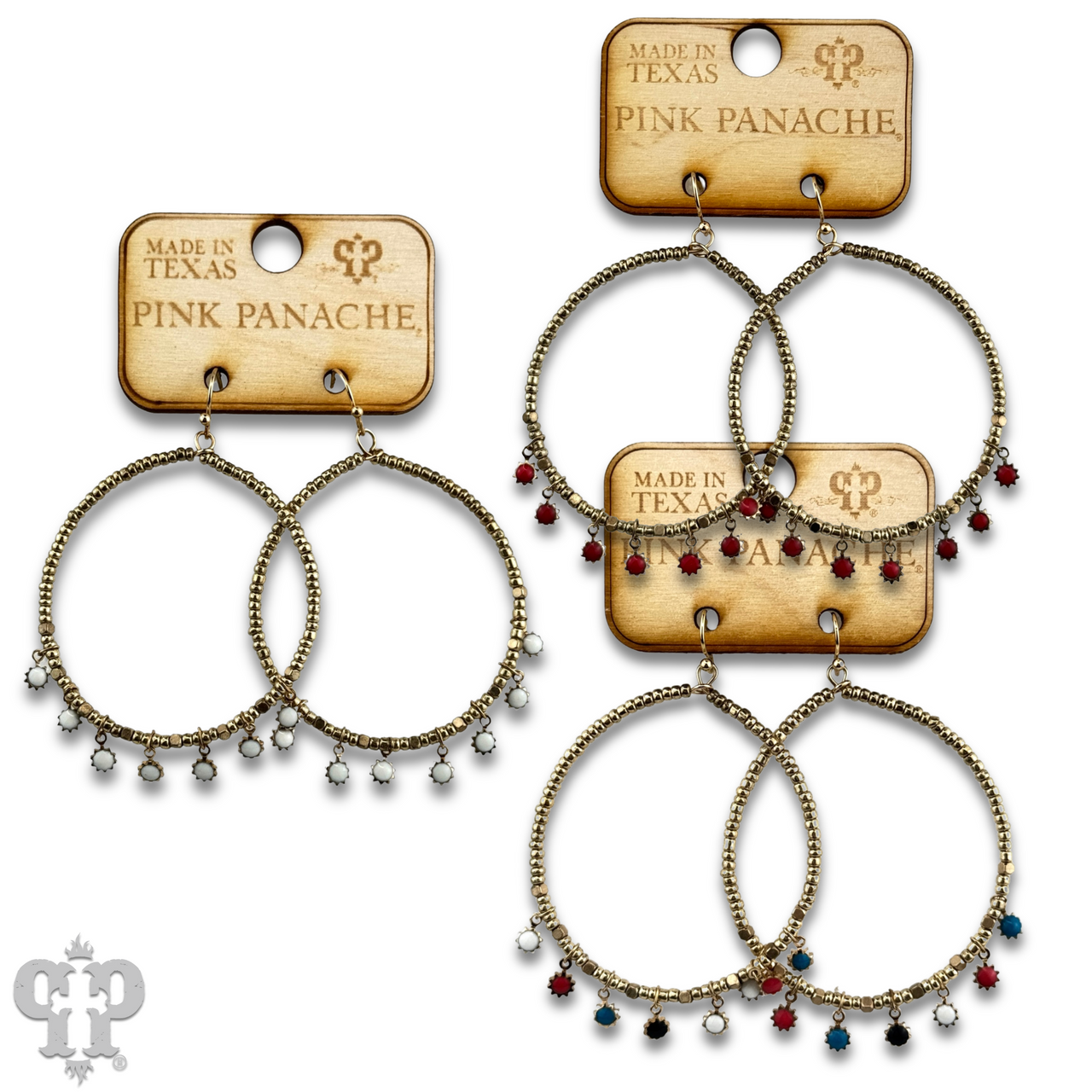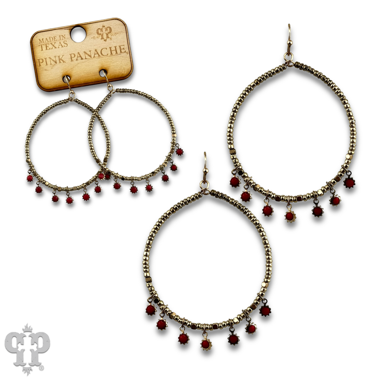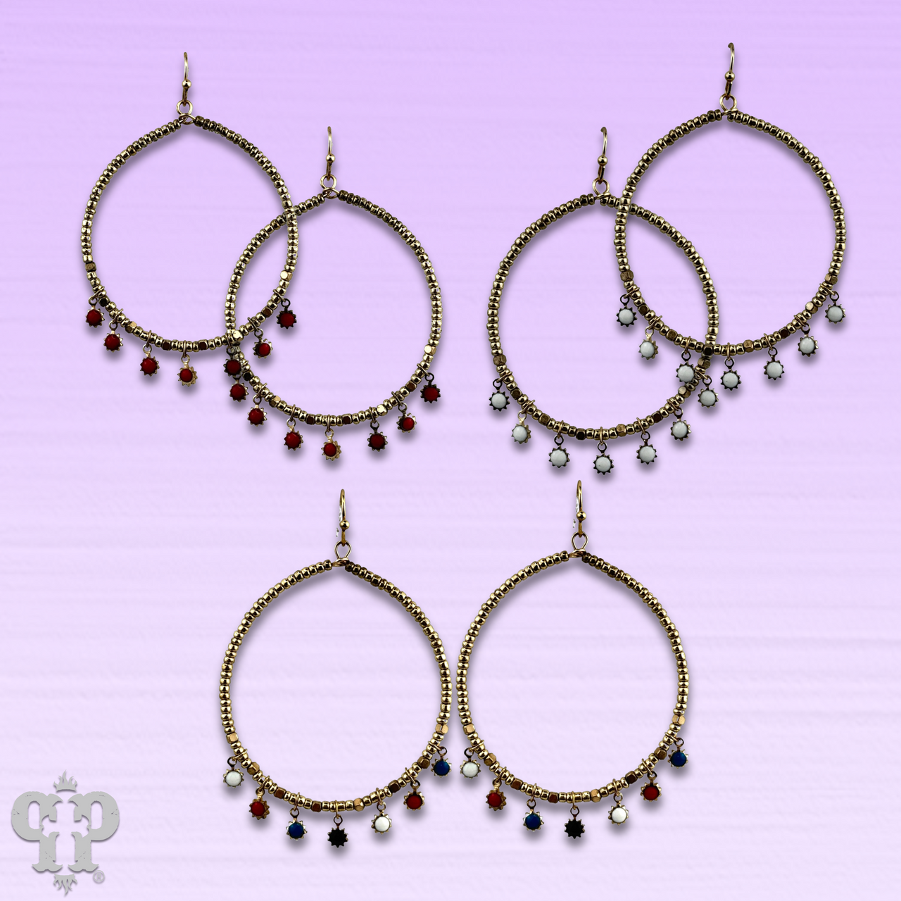 These circle shape earrings have tiny gold tone seed beads threaded onto it. At the bottom are seven little sunburst shape beads. They hang from a french hook.