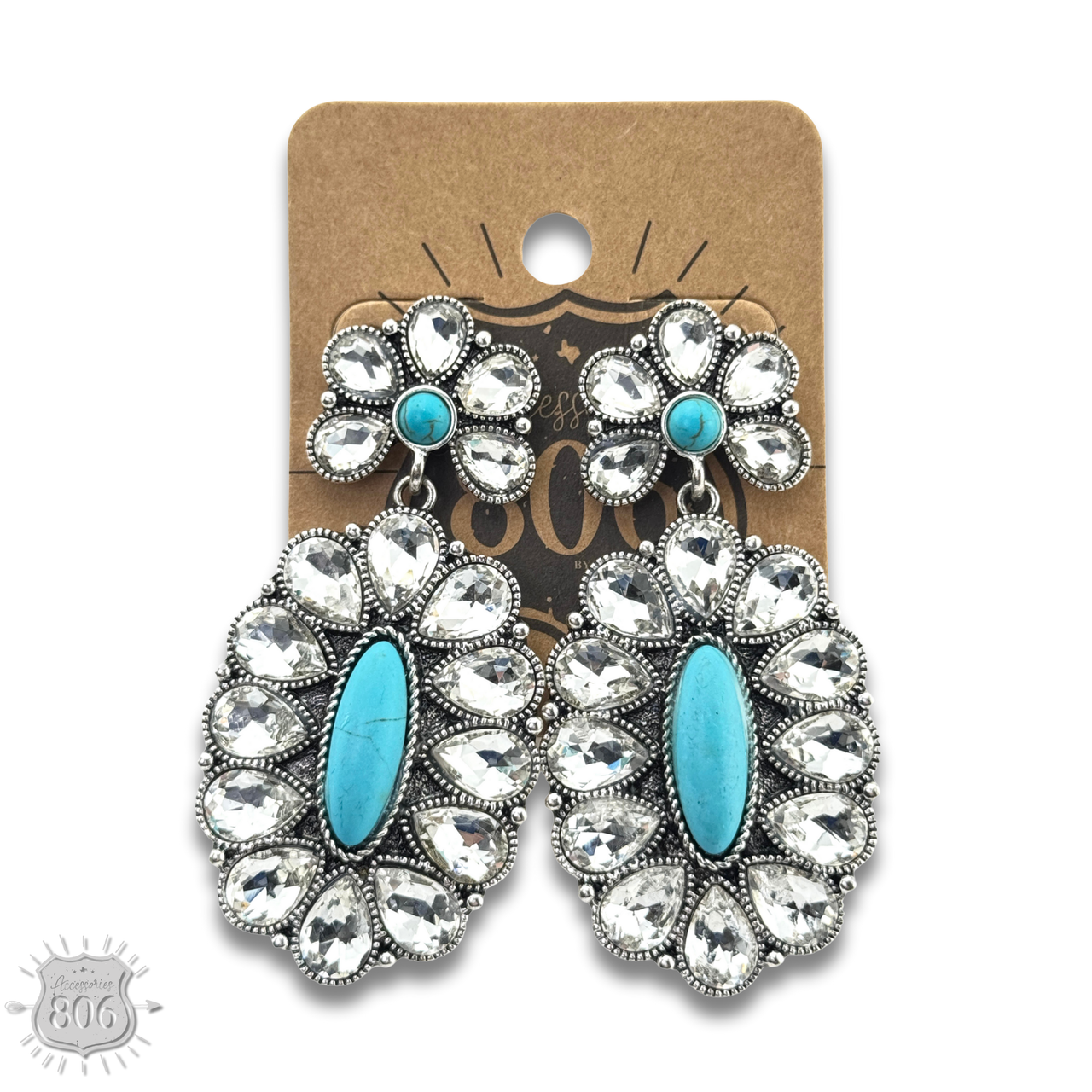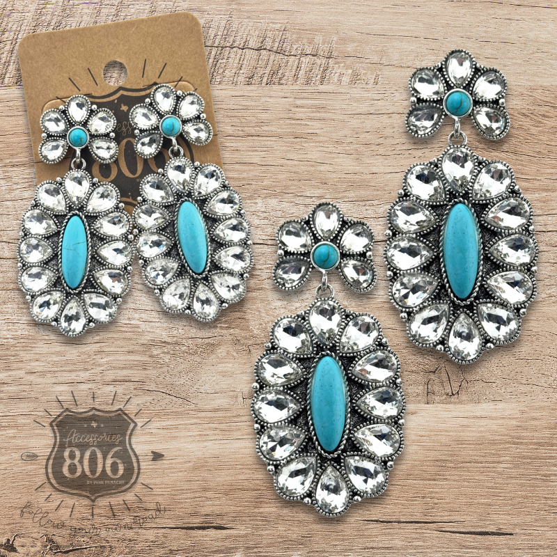 Sparkling teardrop shape rhinestones surround these concho earrings and have a turquoise center stone.