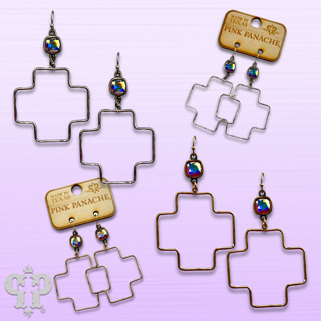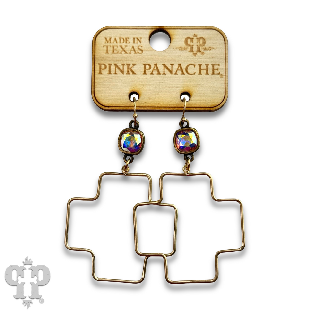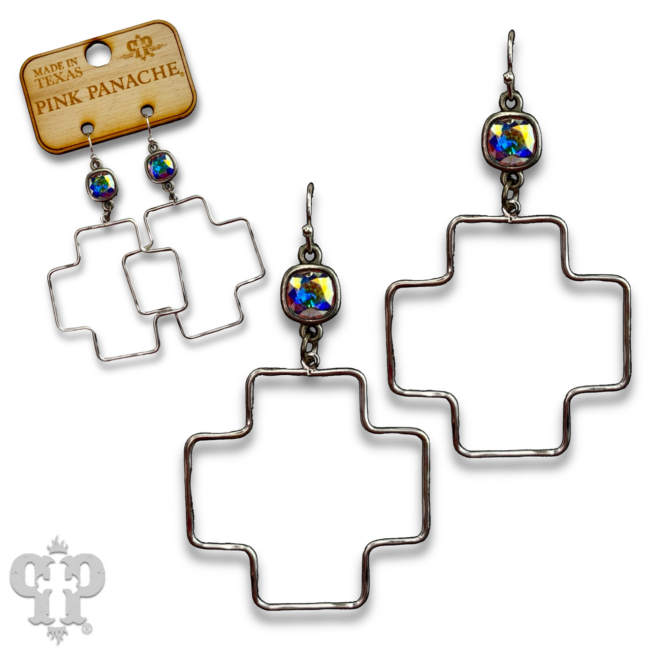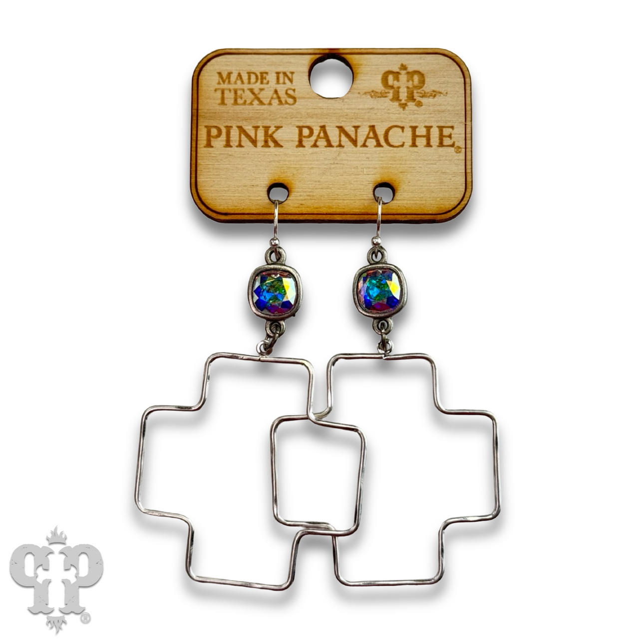These wire square cross earrings hang from an Austrian crystal.