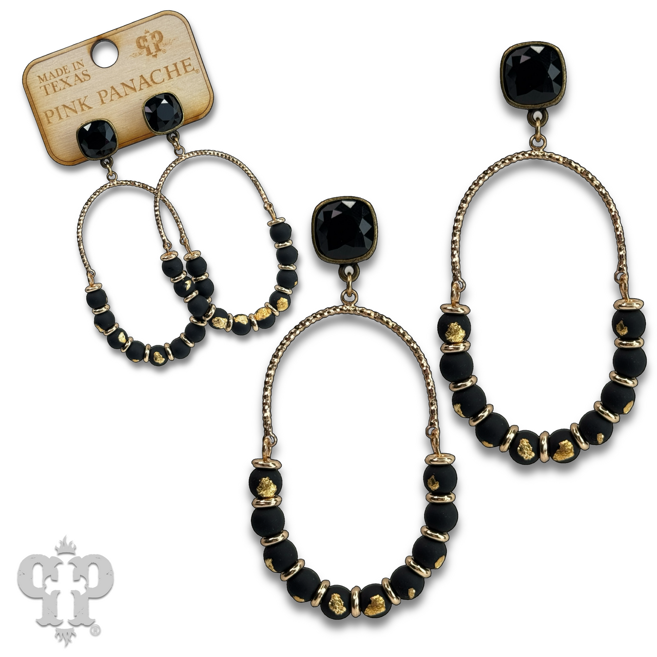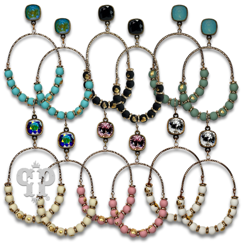 This delightful gold tone arch features wood beads flecked with gold. Dangling from an Austrian crystal, it's the perfect accessory for any occasion.