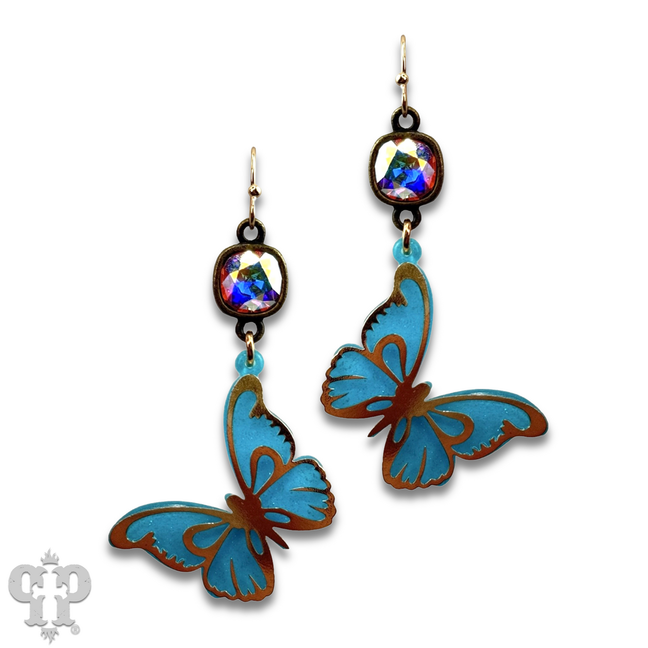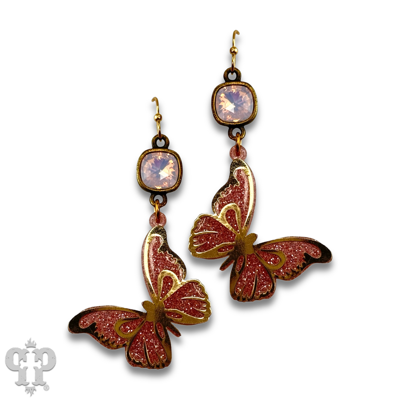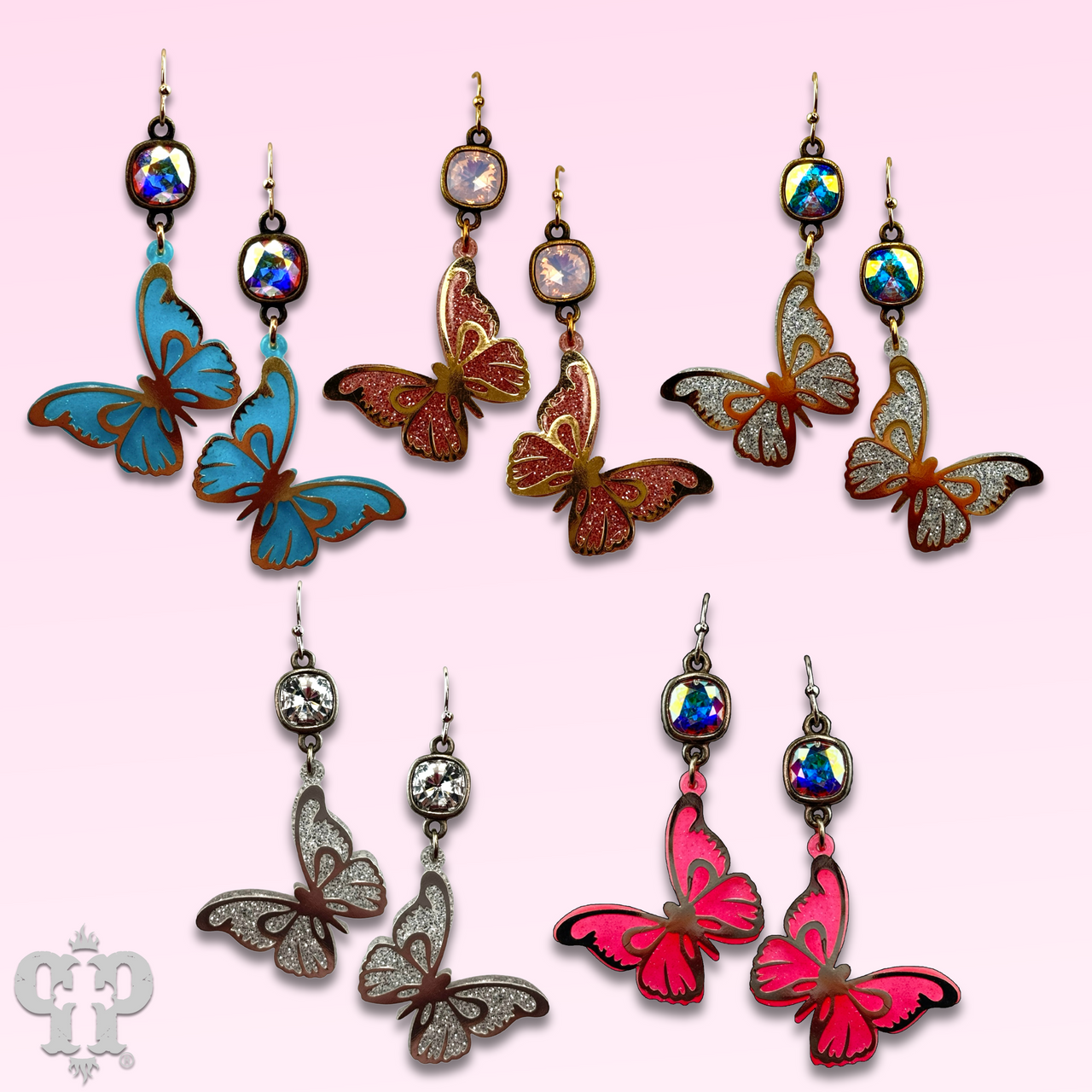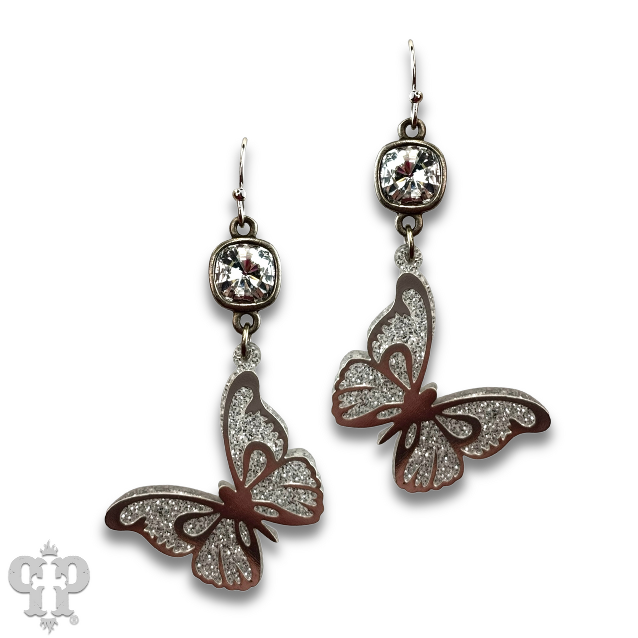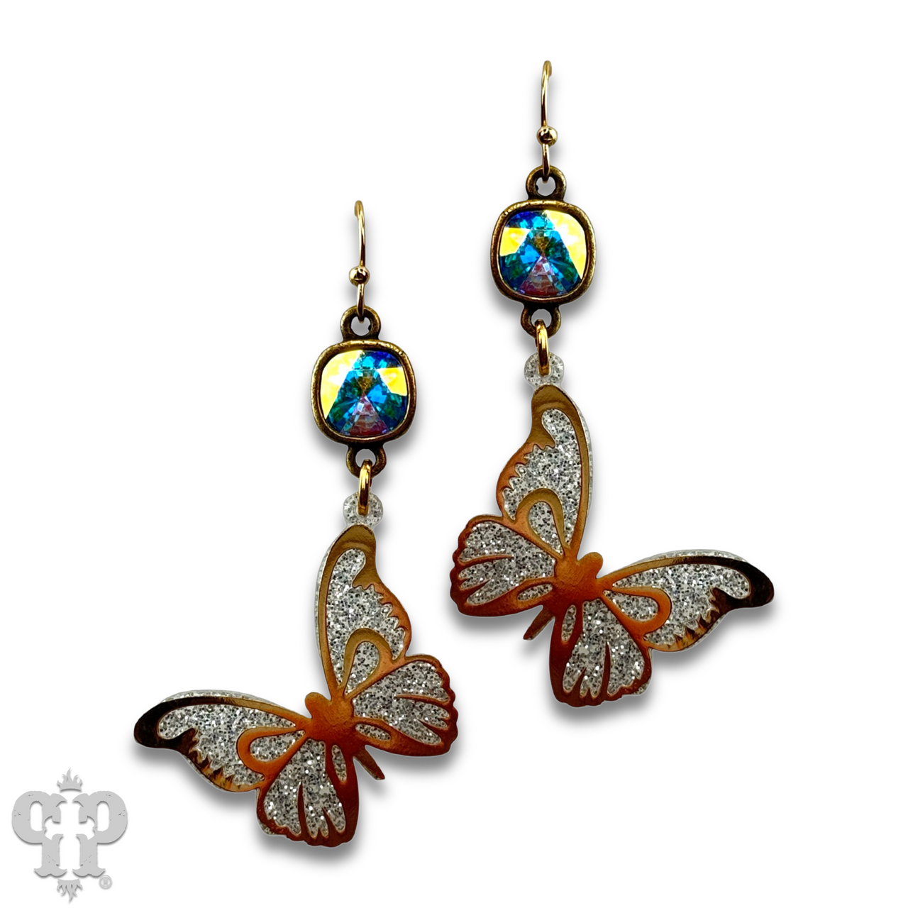 This earring features a butterfly charm made of glitter acrylic with a metallic outline. It dangles from a sparkling Austrian crystal.