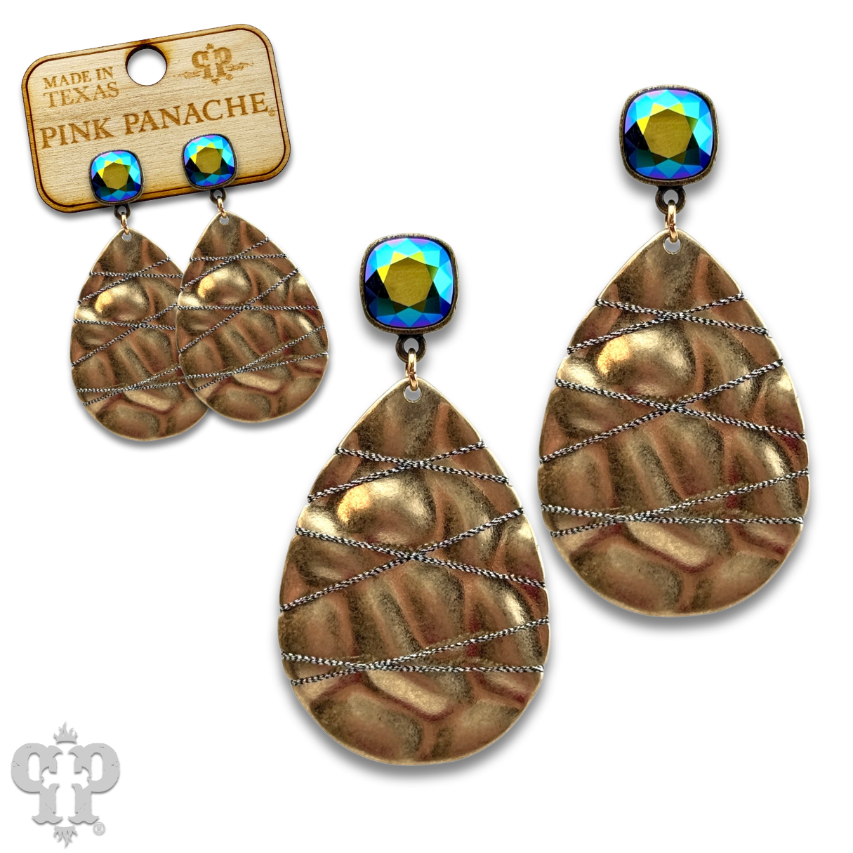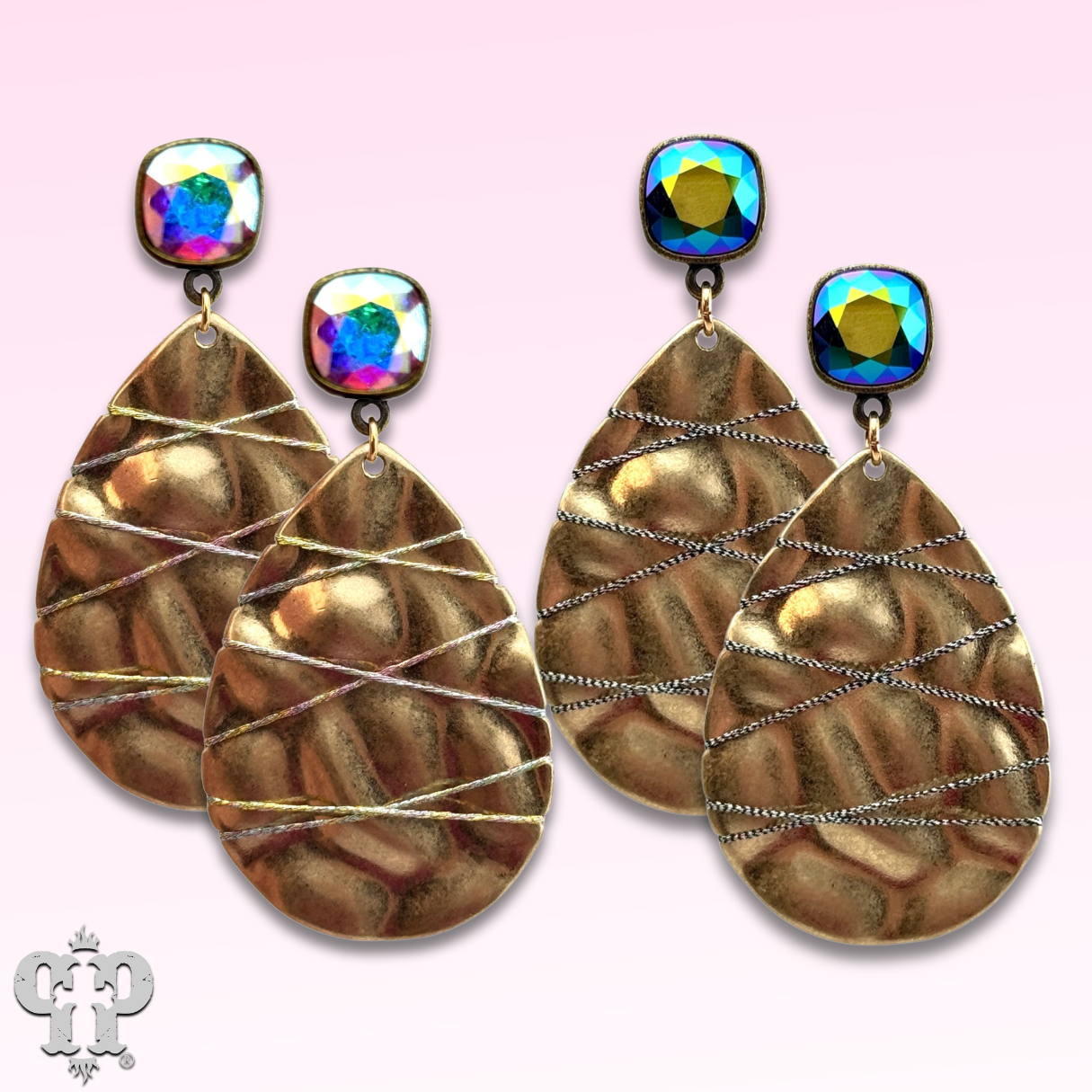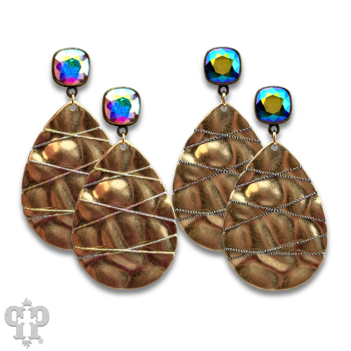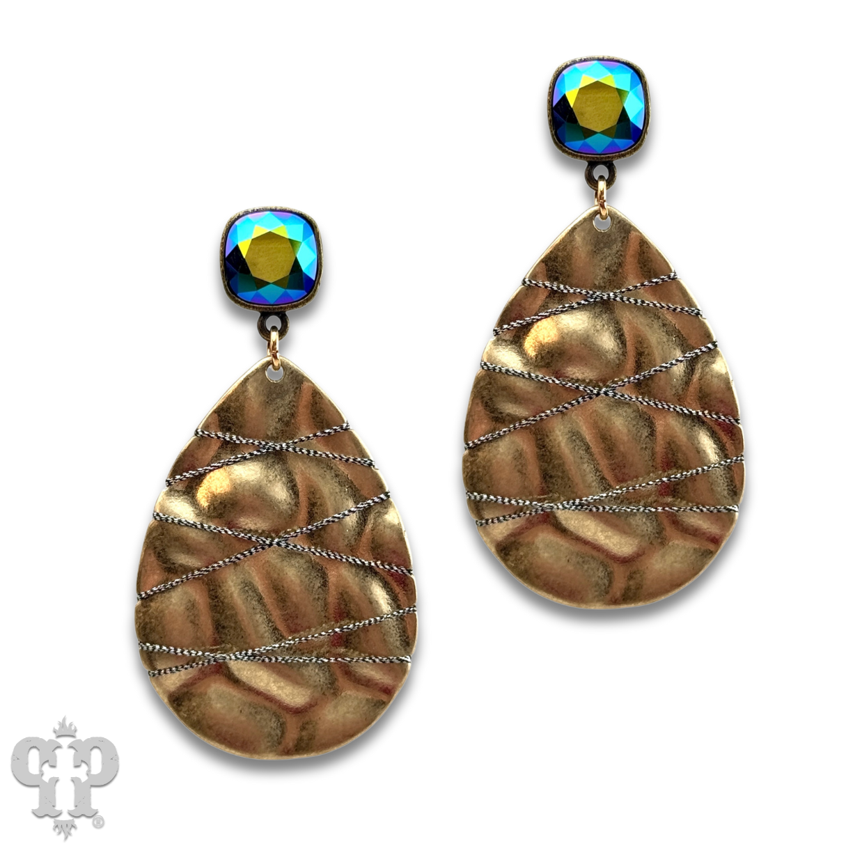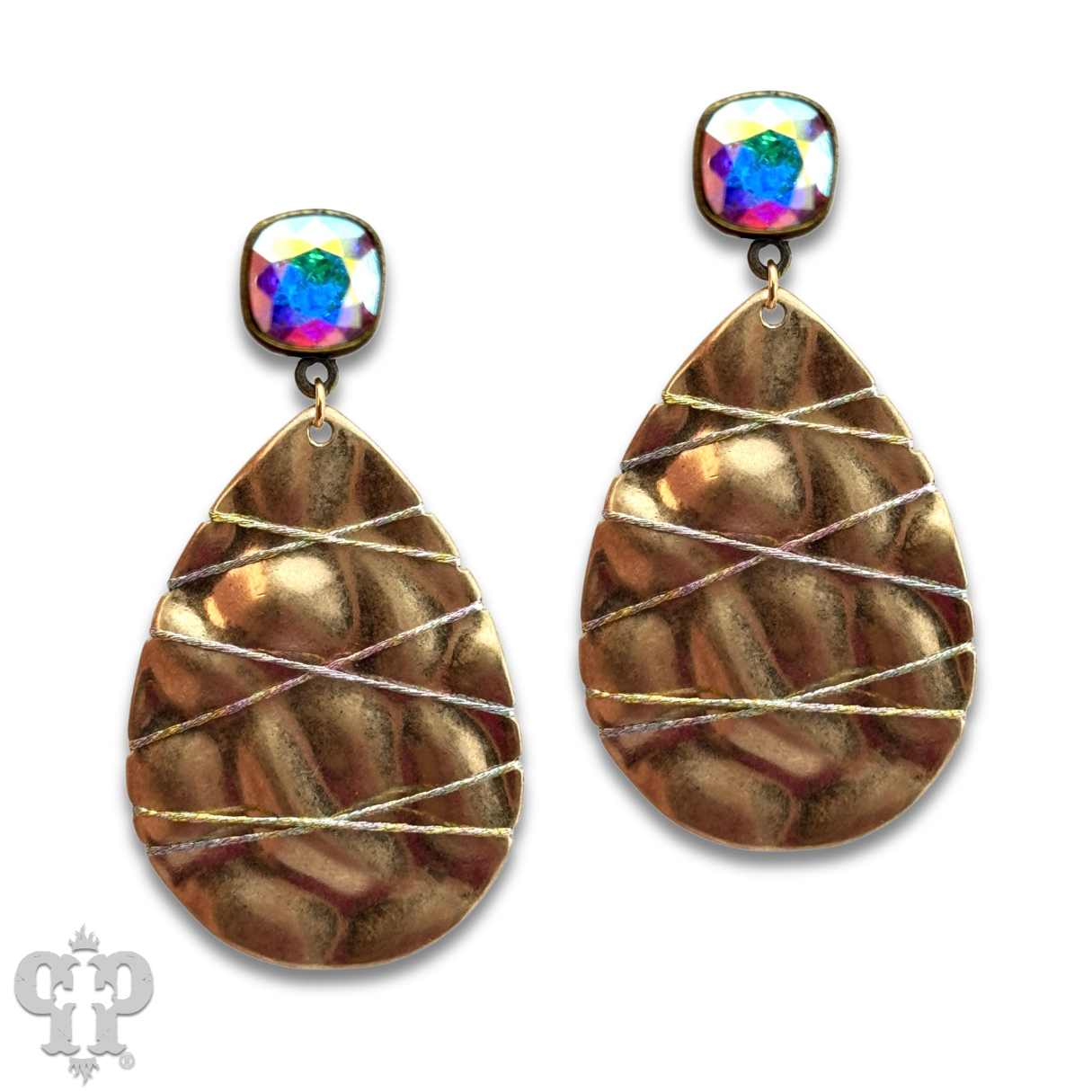 This earring features a hammered look gold tone teardrop with  hematite colored thread crisscrossing over it. It hangs from a 10mm scarabaeus green Austrian crystal post in a setting custom made for Pink Panache in the USA.