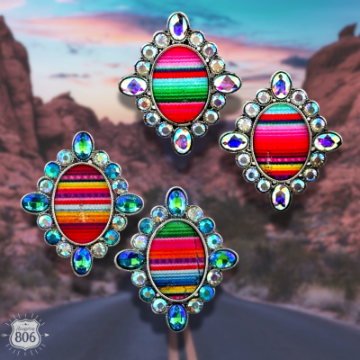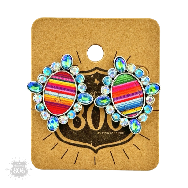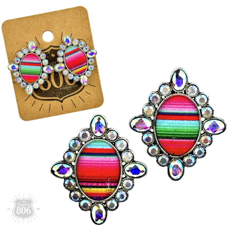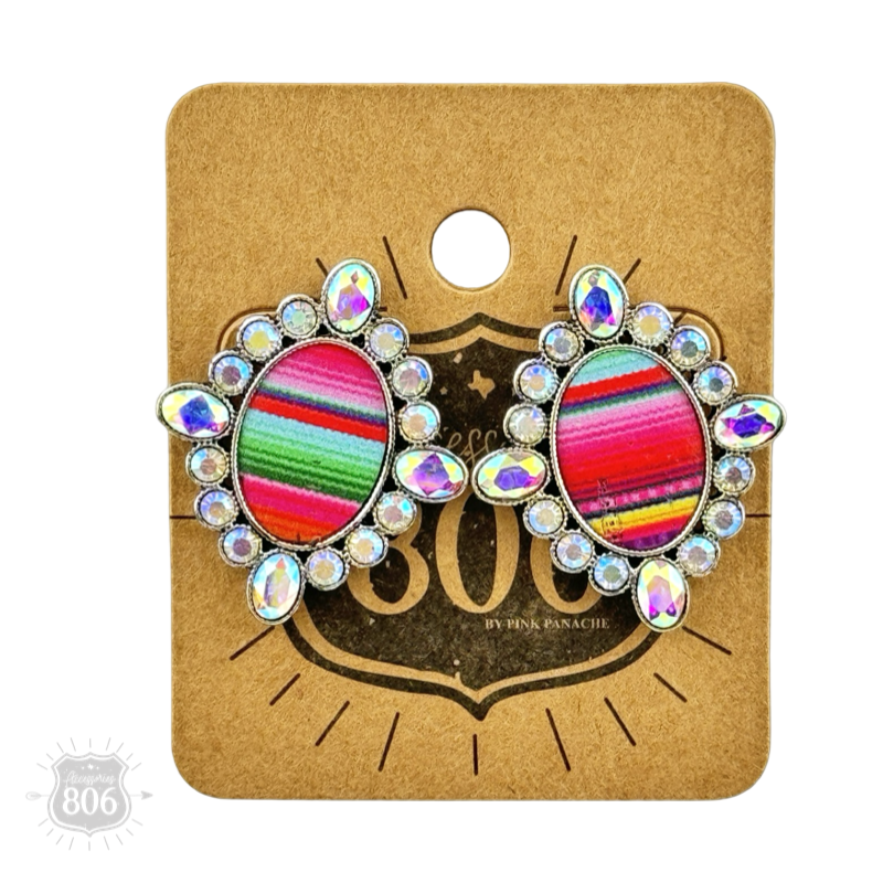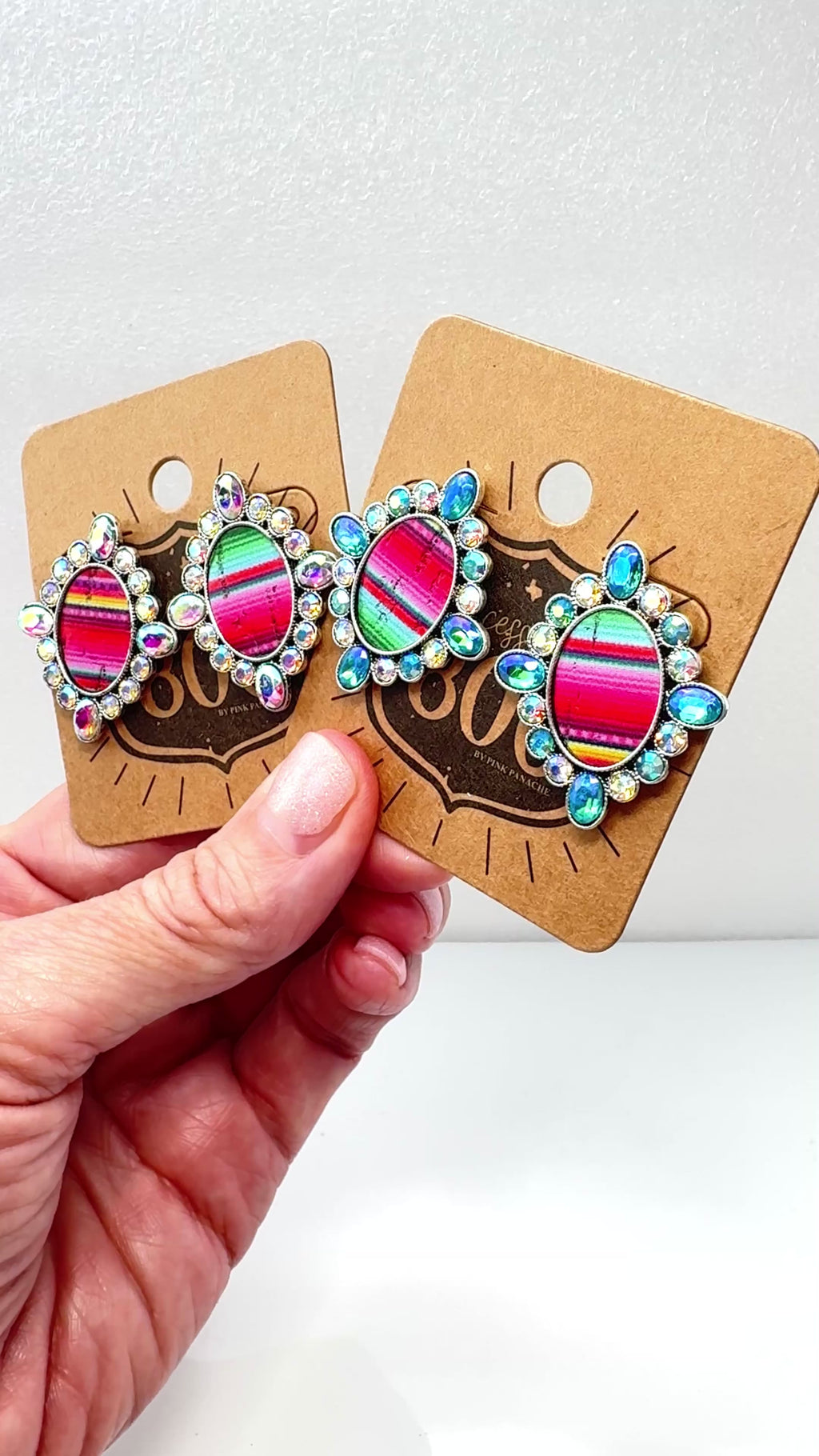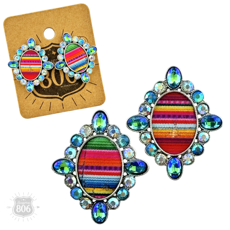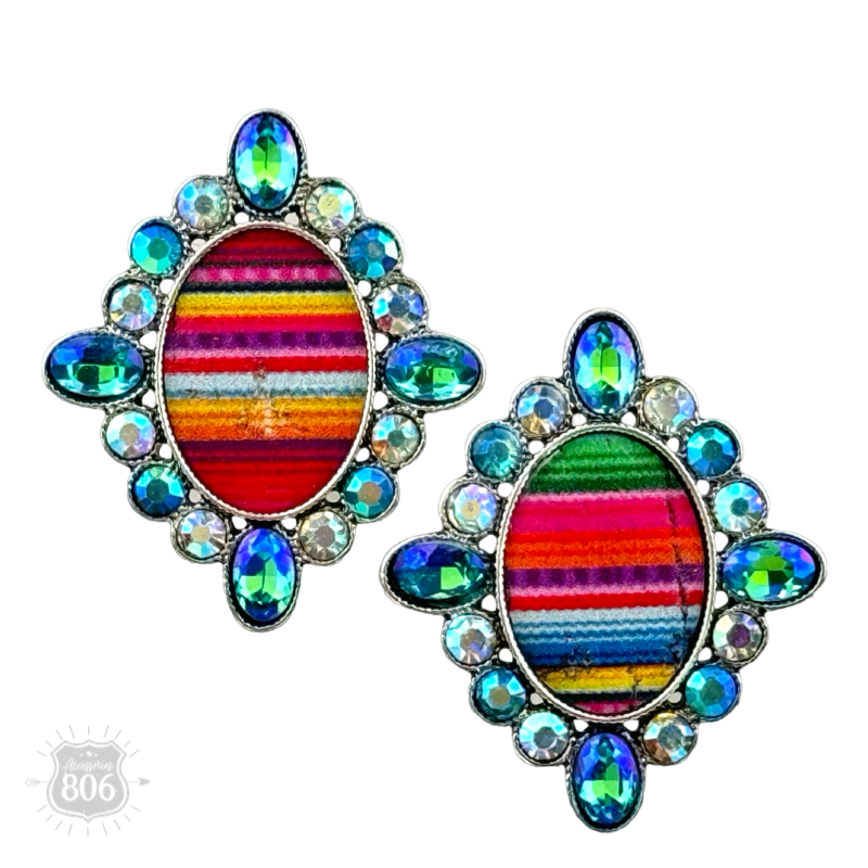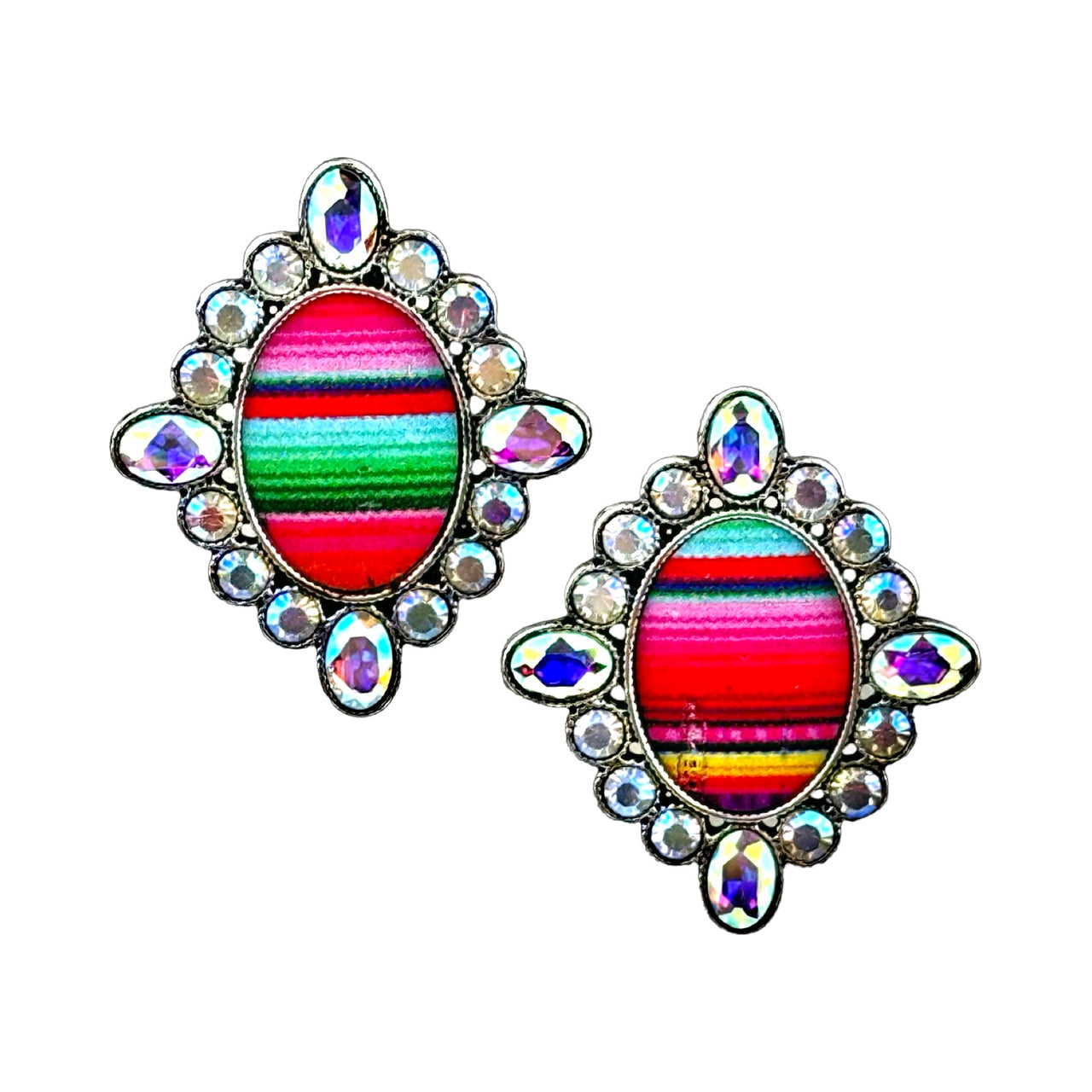 This western style rhinestone earring has a large oval inset serape print surrounded by rhinestones and beads.