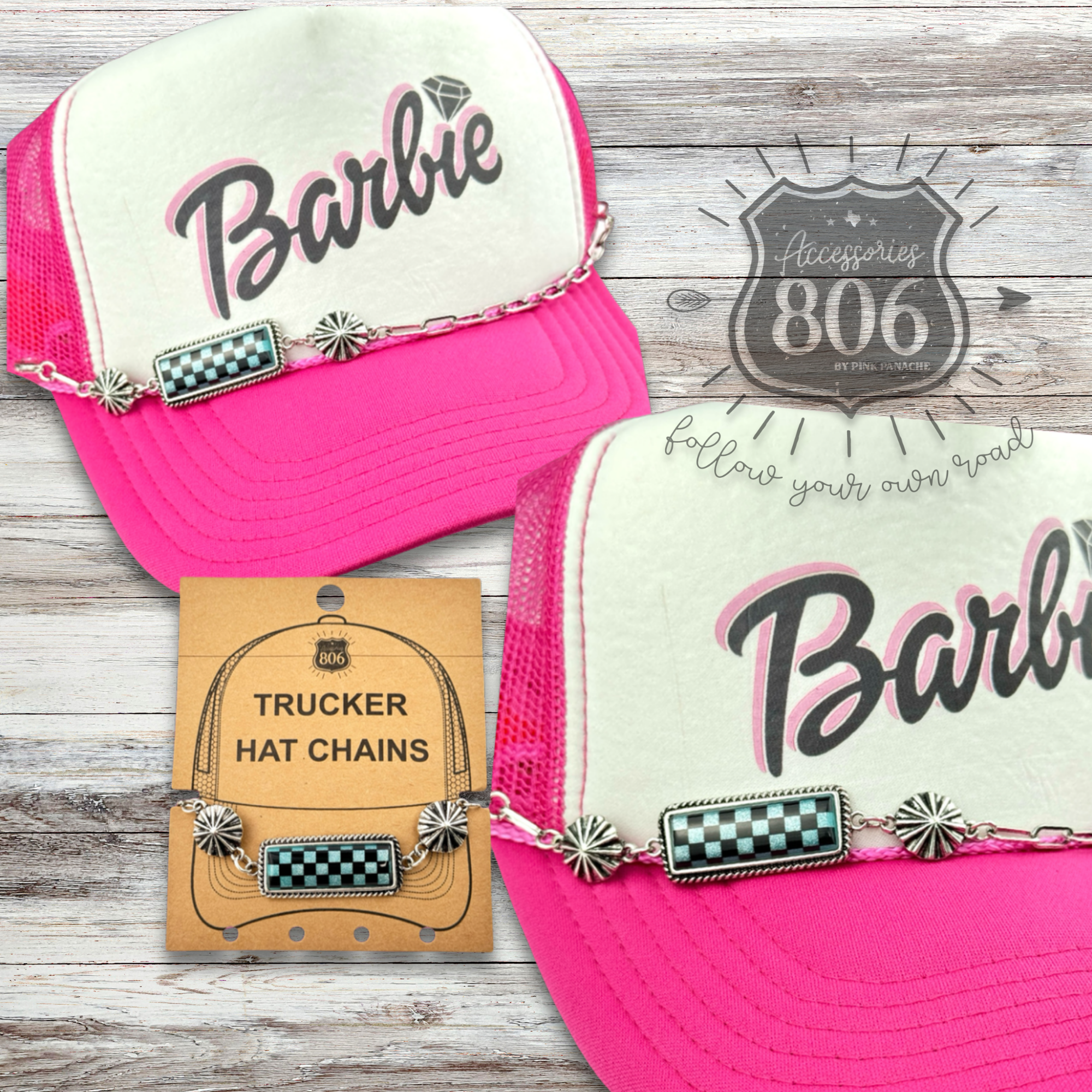 This trucker hat chain has a horizontal checkerboard center with two sunburst conchos on either side. Both features are on a silver tone chain.