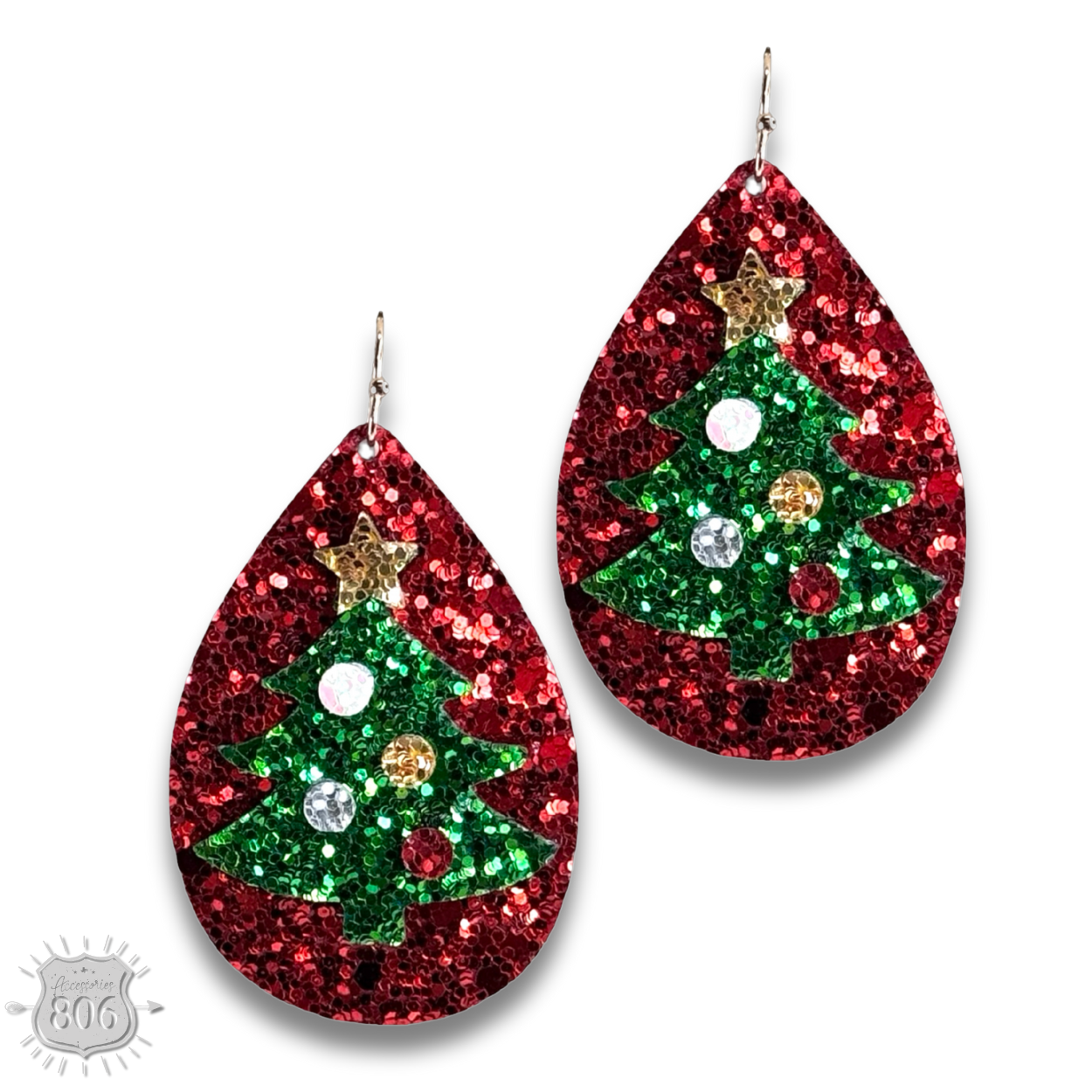 These sequin teardrop earrings feature a Christmas tree in the center.  The earrings hang from a french hook.
