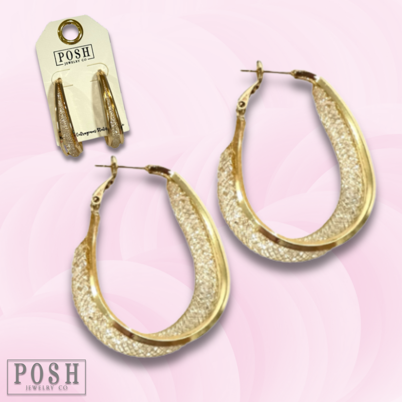 This oval hoop earring with a flip latch closure has a double gold tone rim with crystal mesh in between.