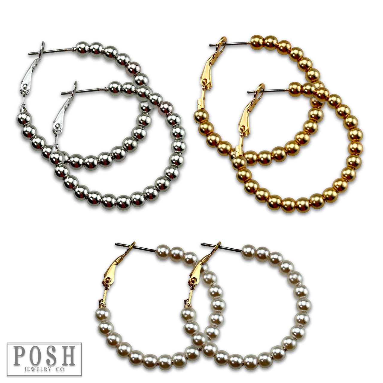 This hoop earring has round beads from front to back. The closure is a flip latch making it easy to put on and take off.