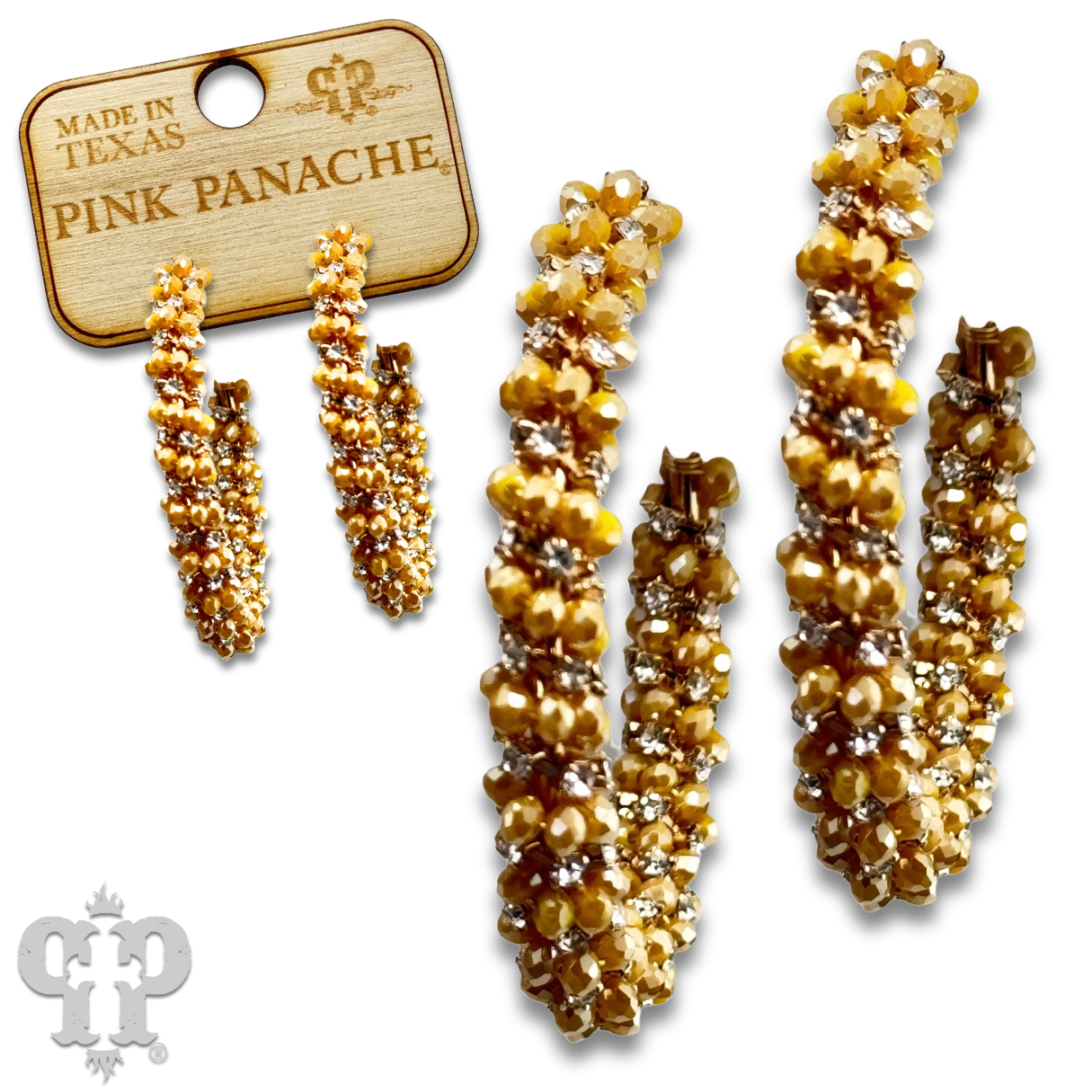 This earring is adorned with seed beads and sparkling rhinestones woven onto a hoop.
