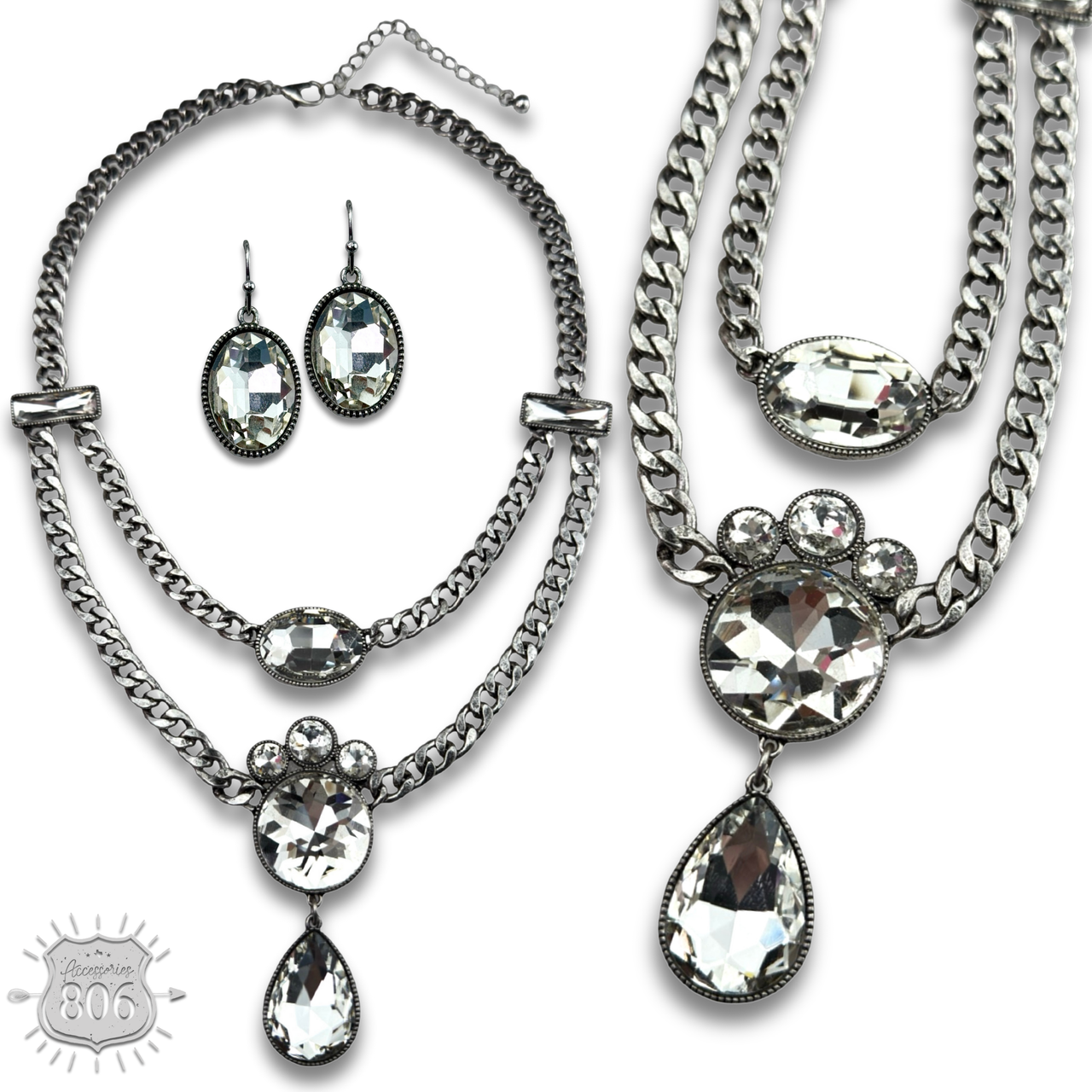 This necklace set comes with a duo of jewels - a layered necklace adorned with rocks and rhinestones, and coordinating earrings.