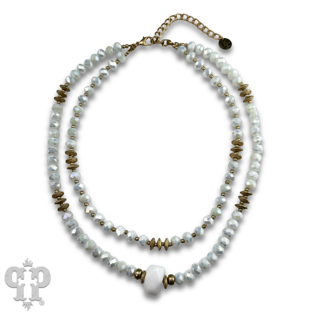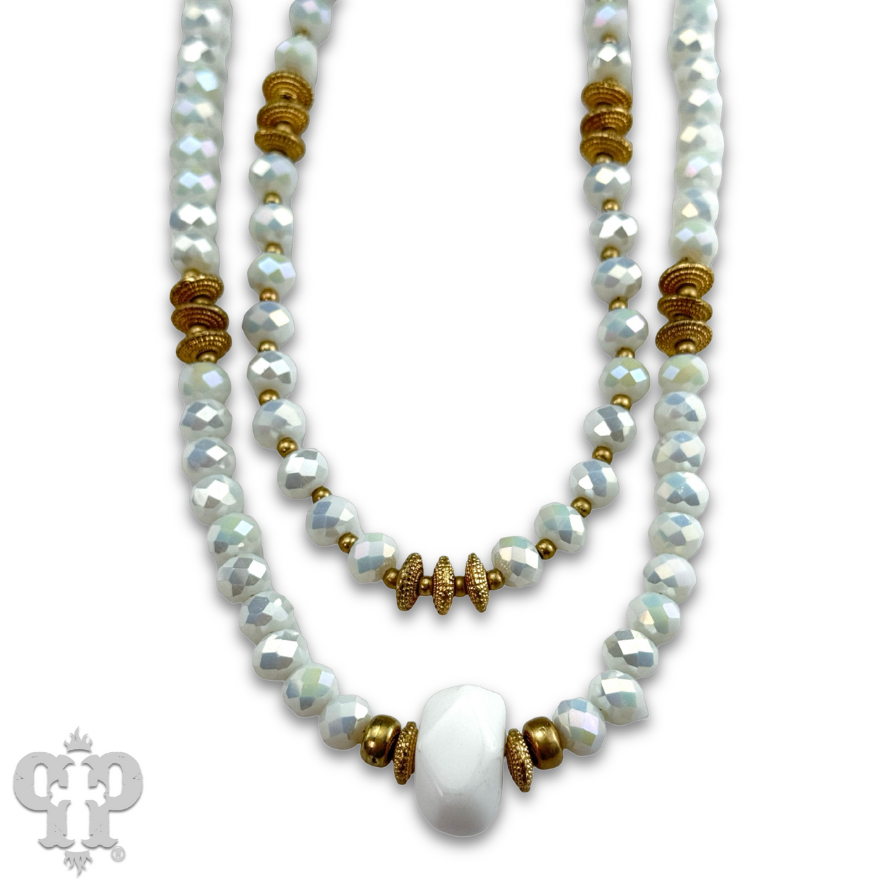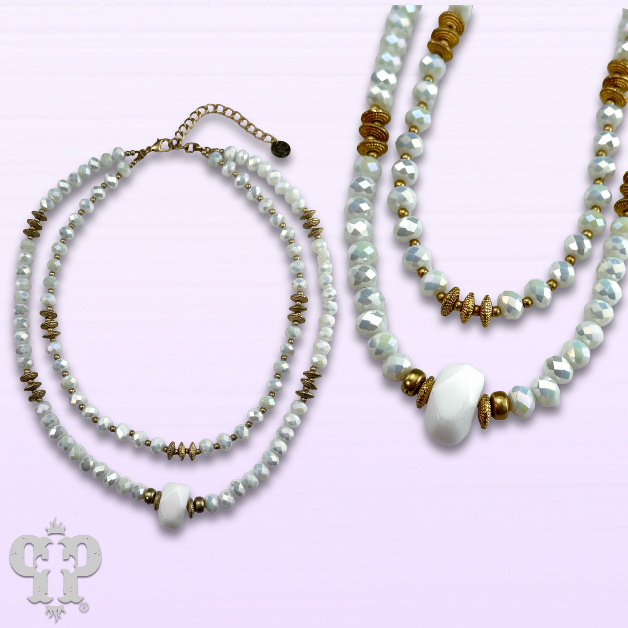 This necklace has two strands of white crystal and gold disc beads and a large white stone center.  The shortest length is approximately 15 inches and it has an extender chain.