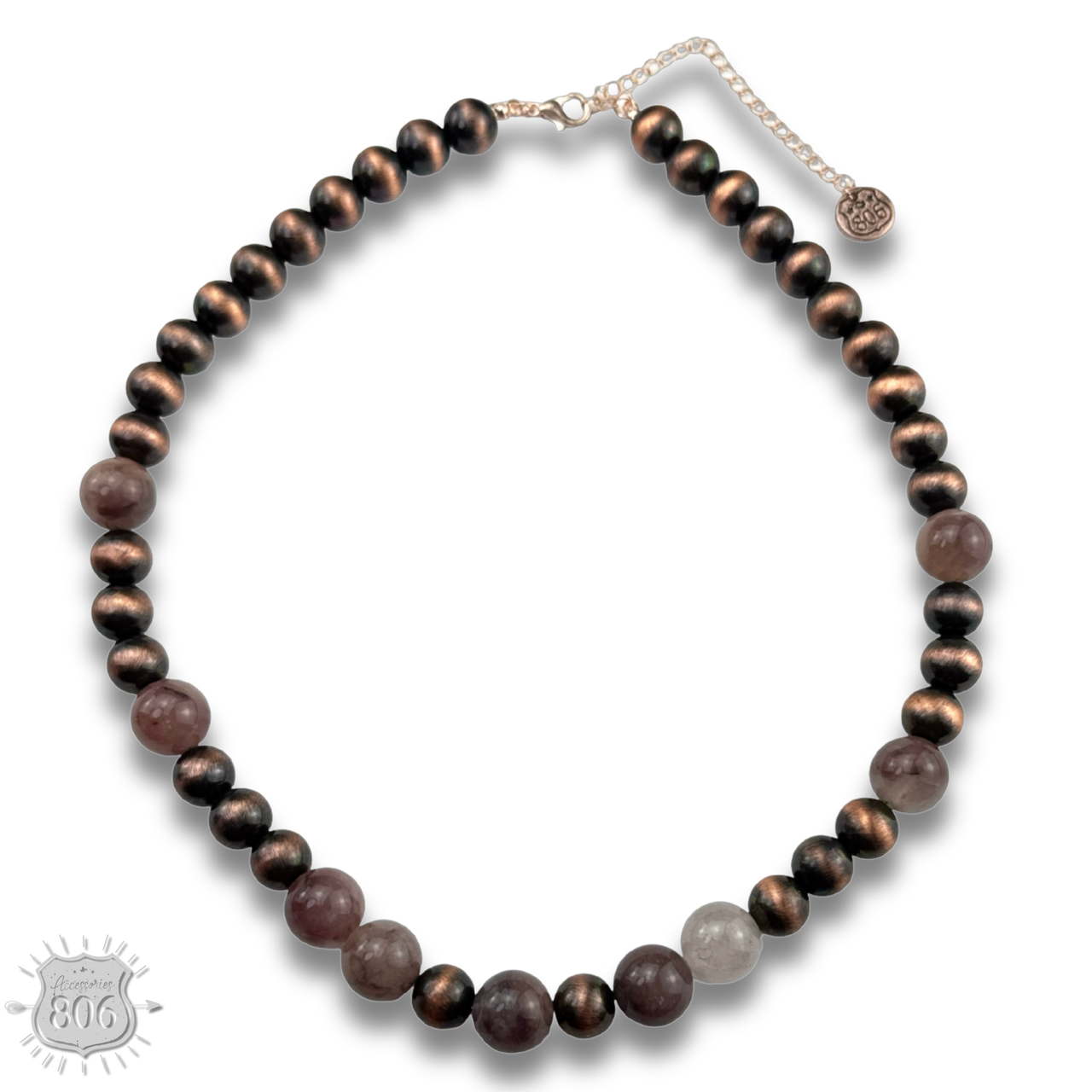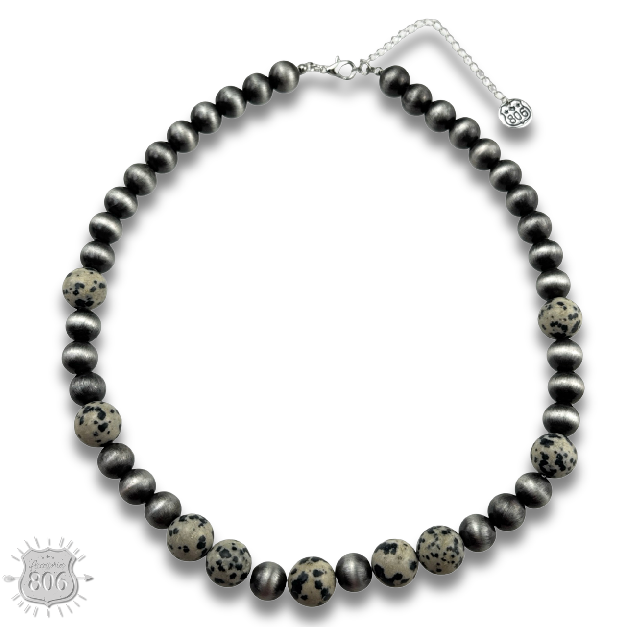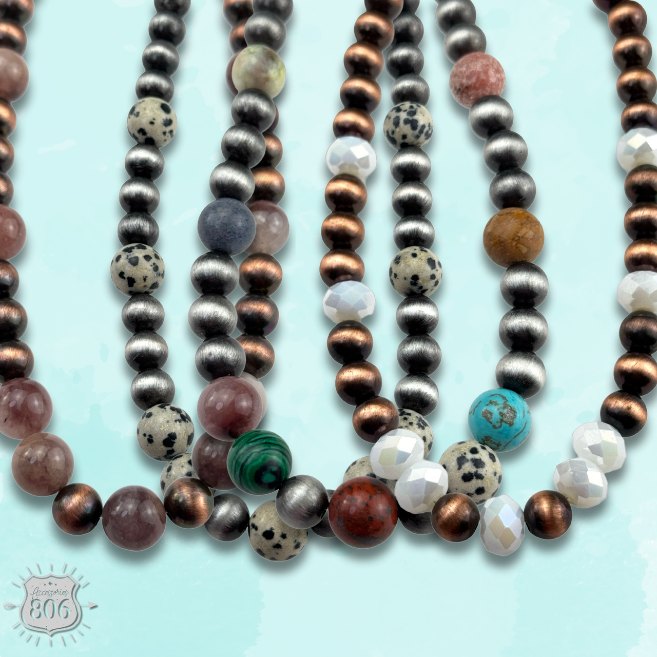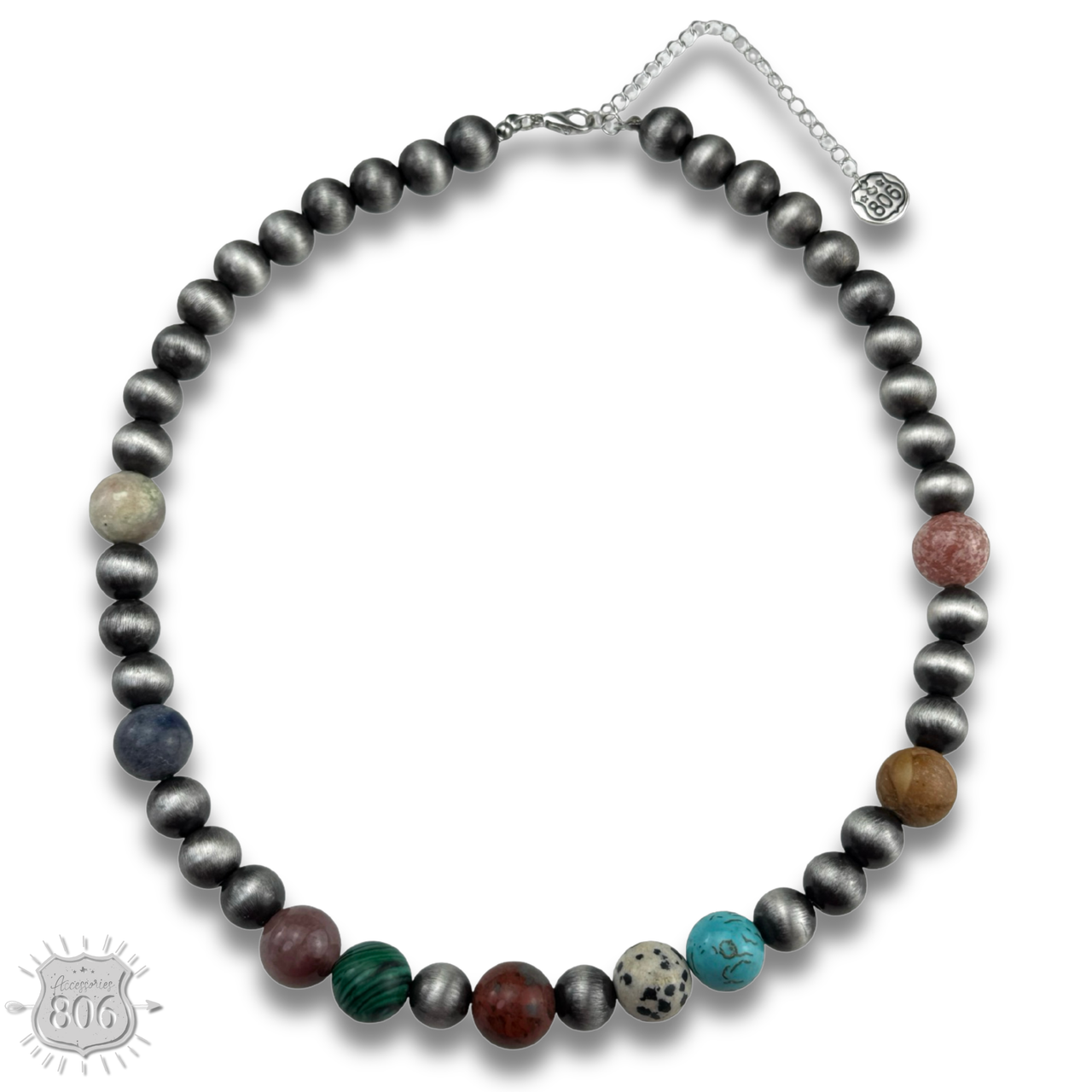 Get ready to make a statement with this necklace, complete with burnished and beautiful stone beads.