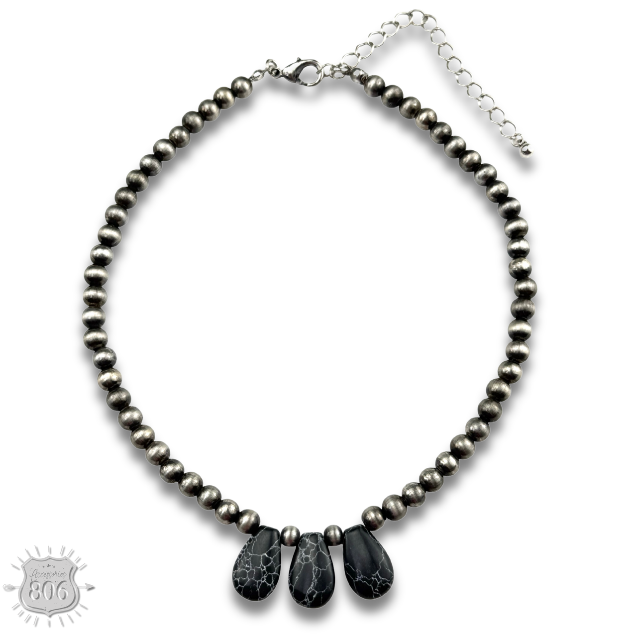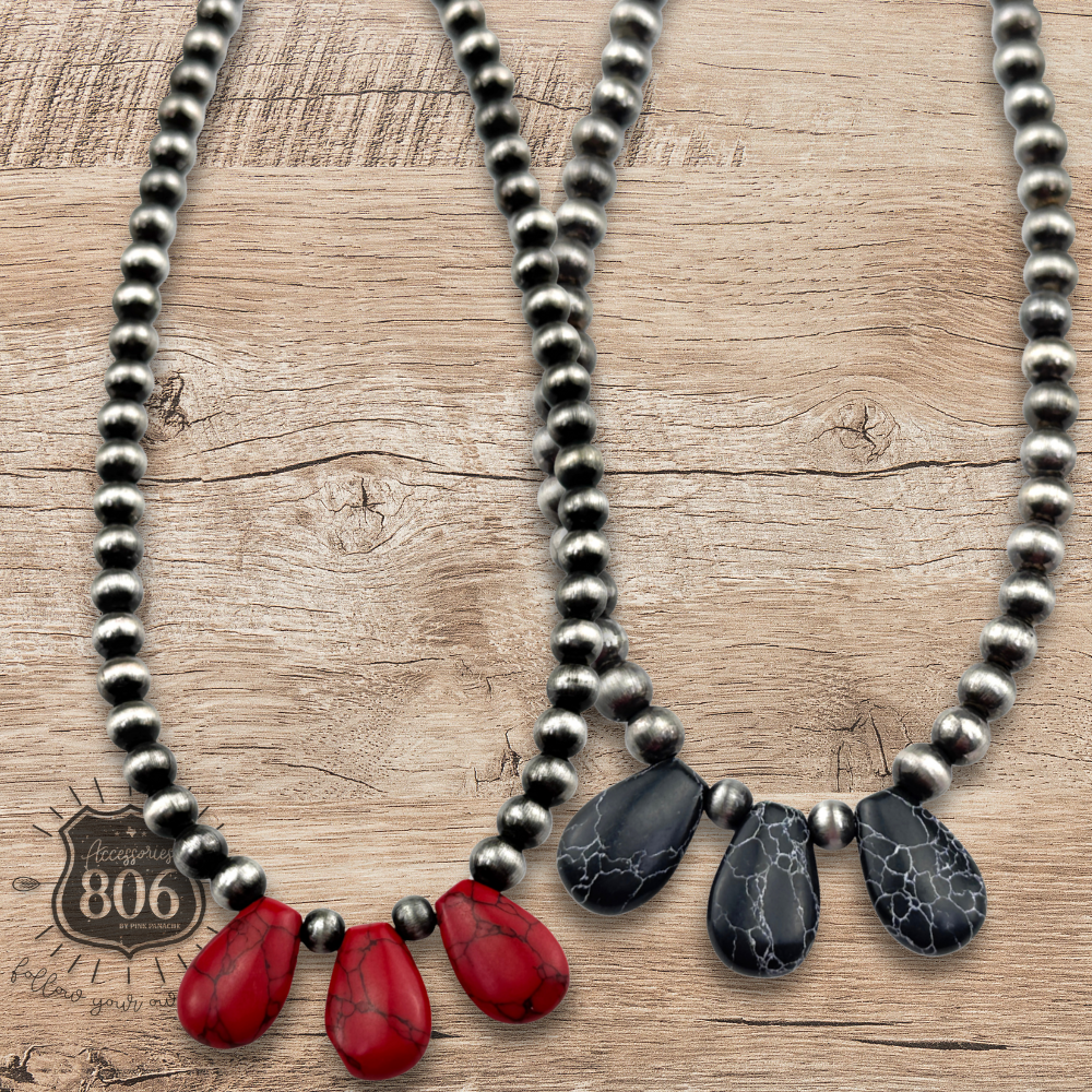This necklace has western style silver tone burnished beads, plus three charming teardrop stones in classic colors.