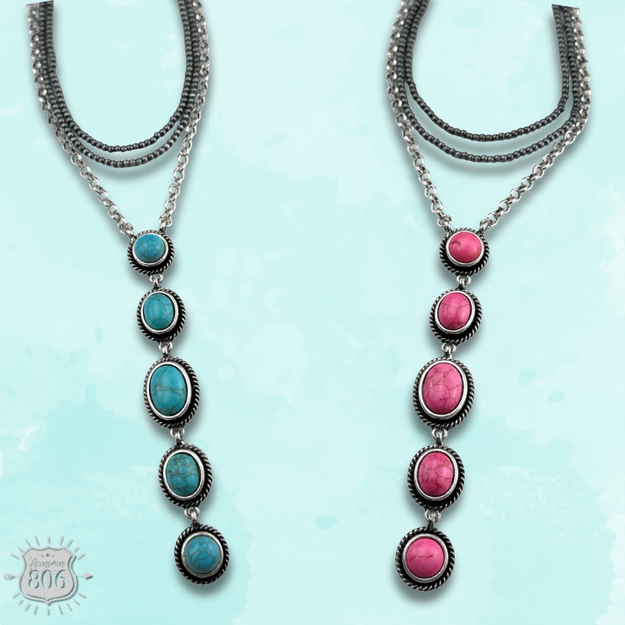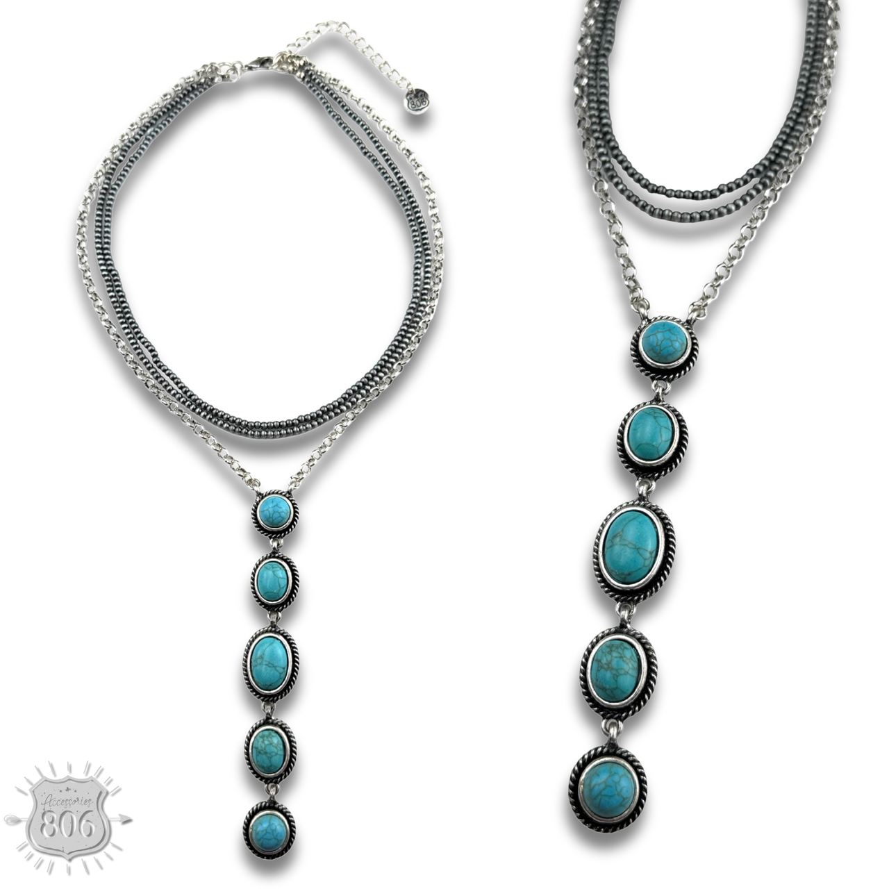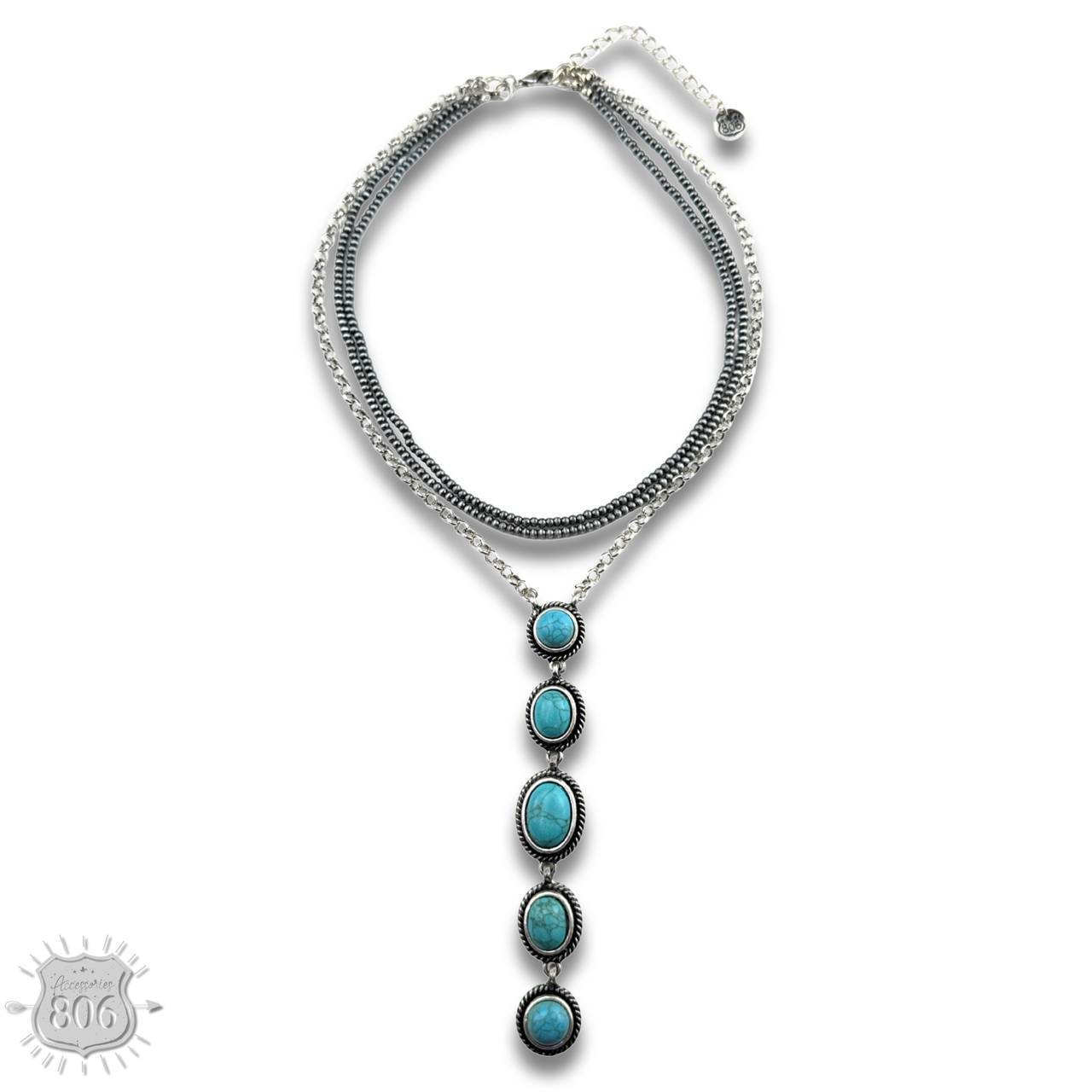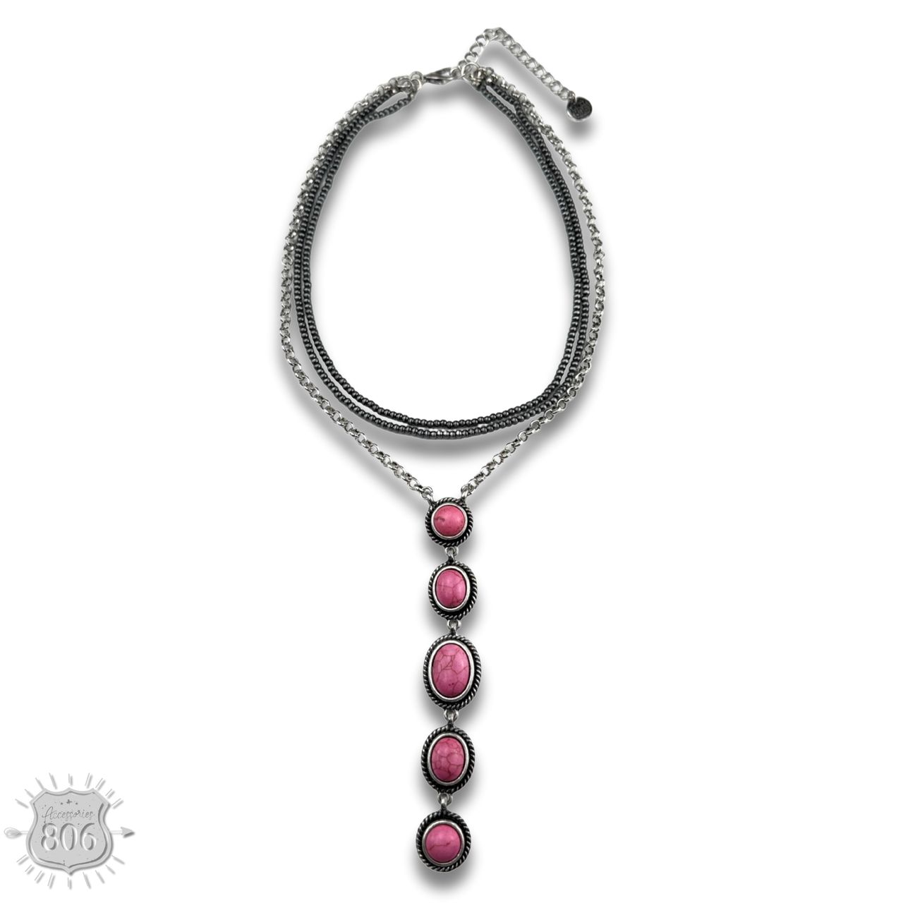 This necklace boasts three strands of silver-toned burnished beads and chain, while the pendant adds an extra touch with five stone drops.