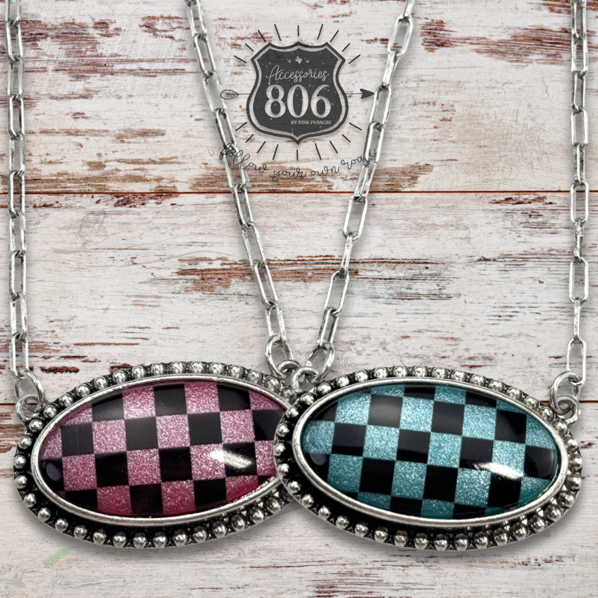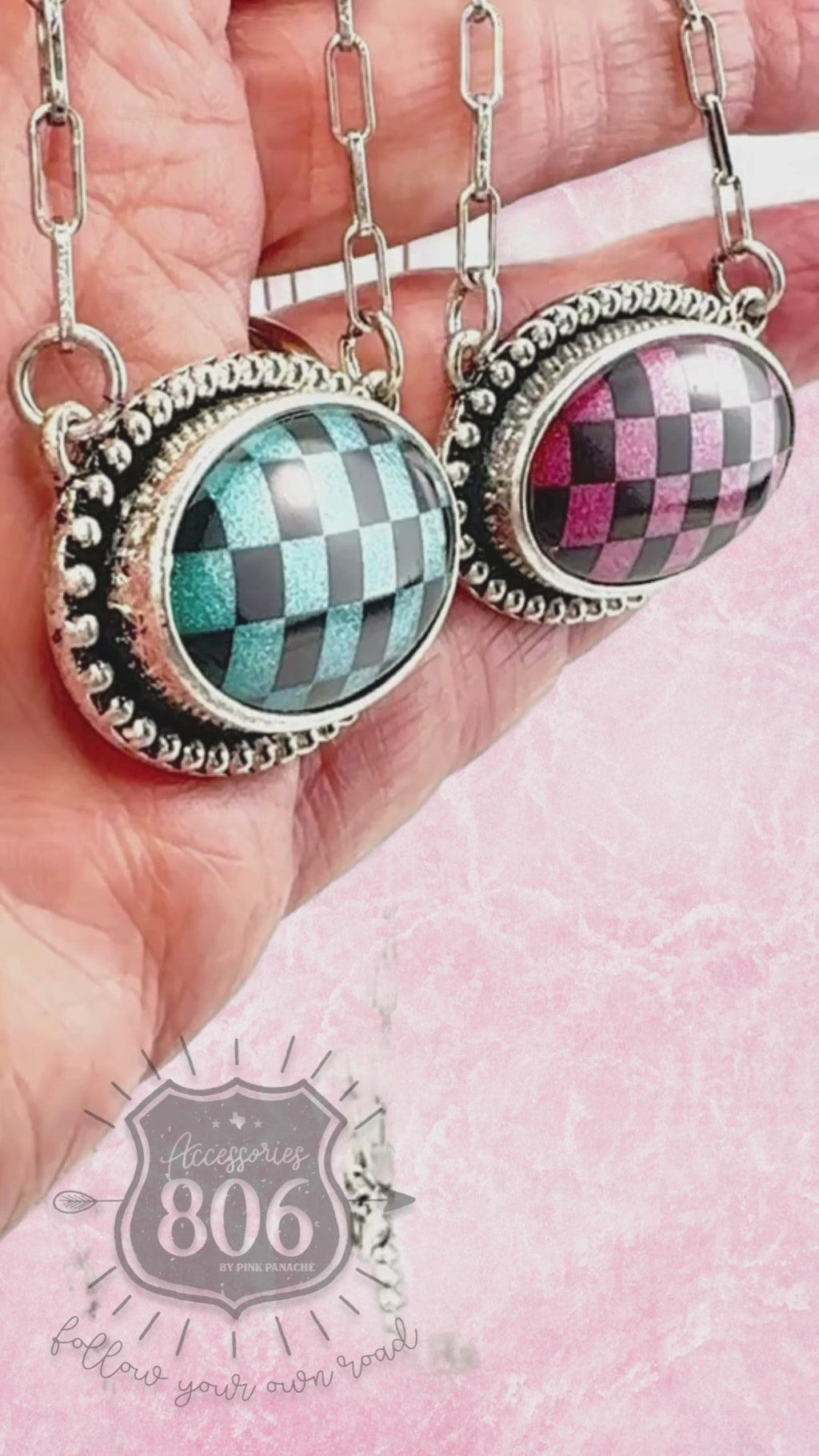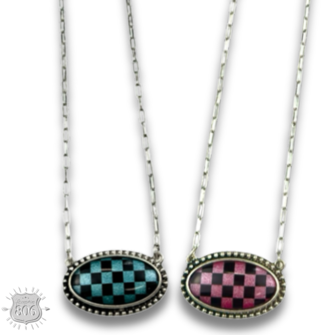This silver tone paperclip chain necklace has an oval checkerboard pendant.