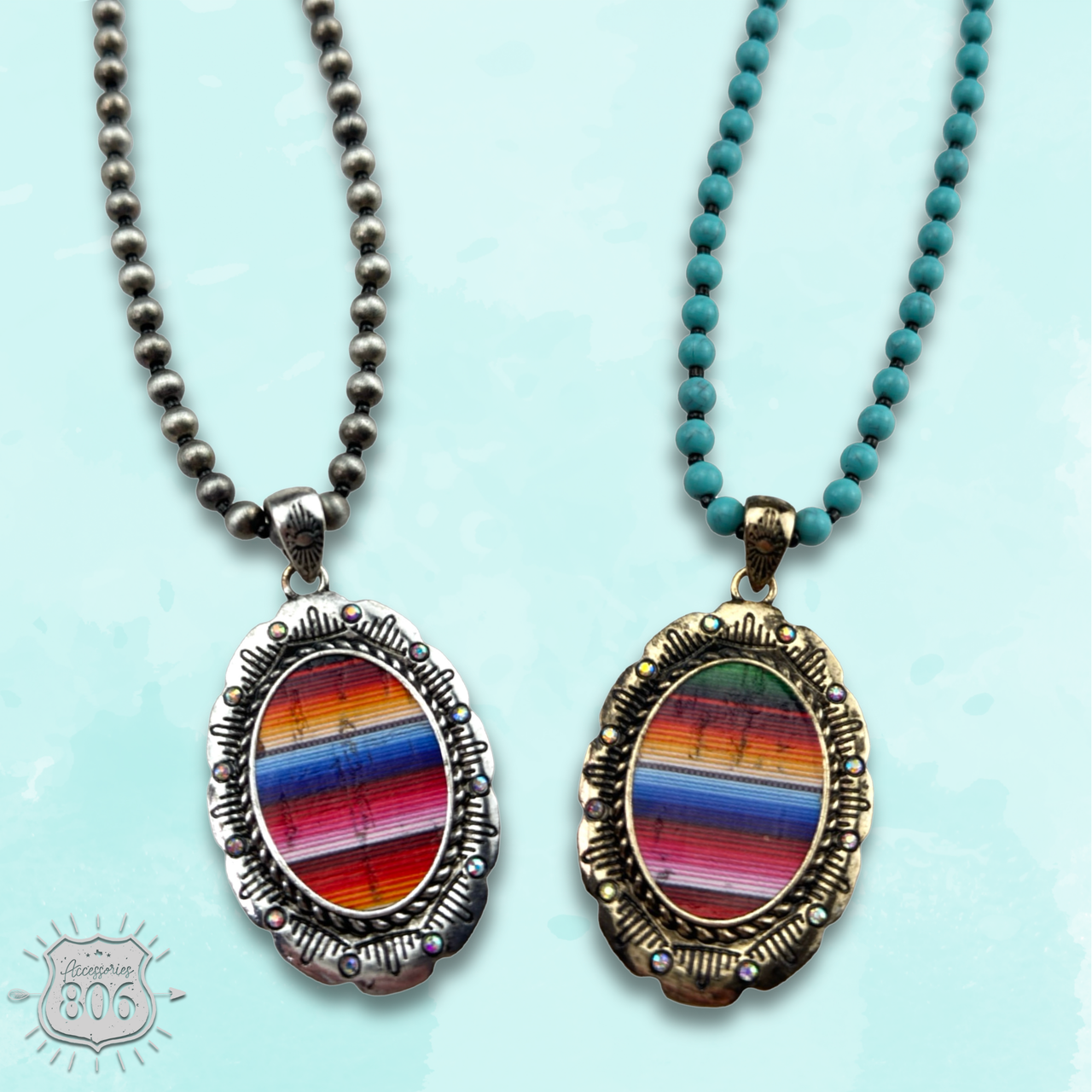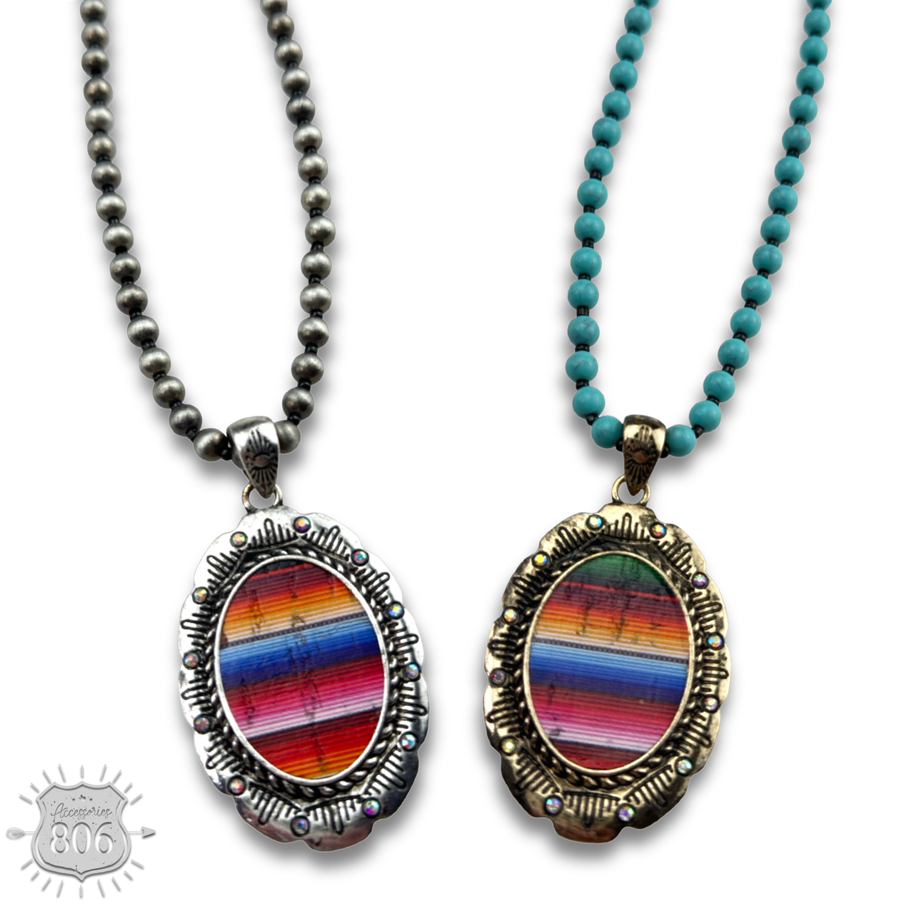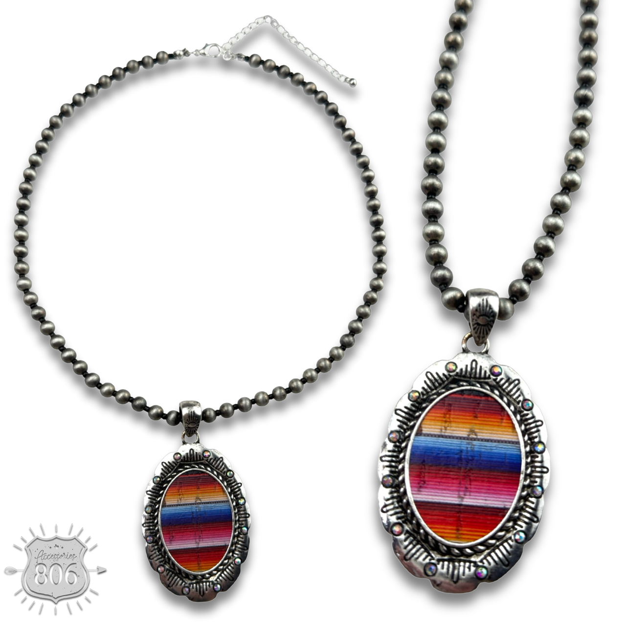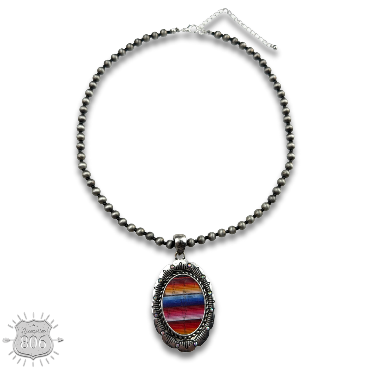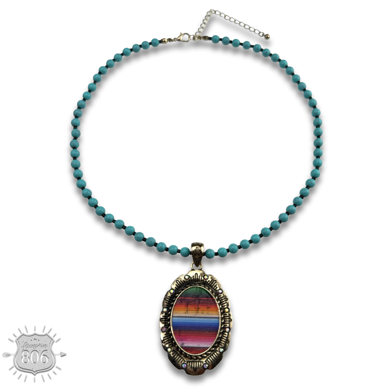 This necklace has round beads with little seed beads in between each bead. It features a stamped oval pendant with a serape center and has iridescent rhinestones around the rim.