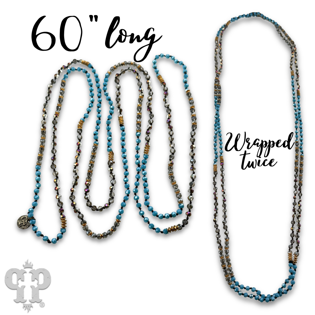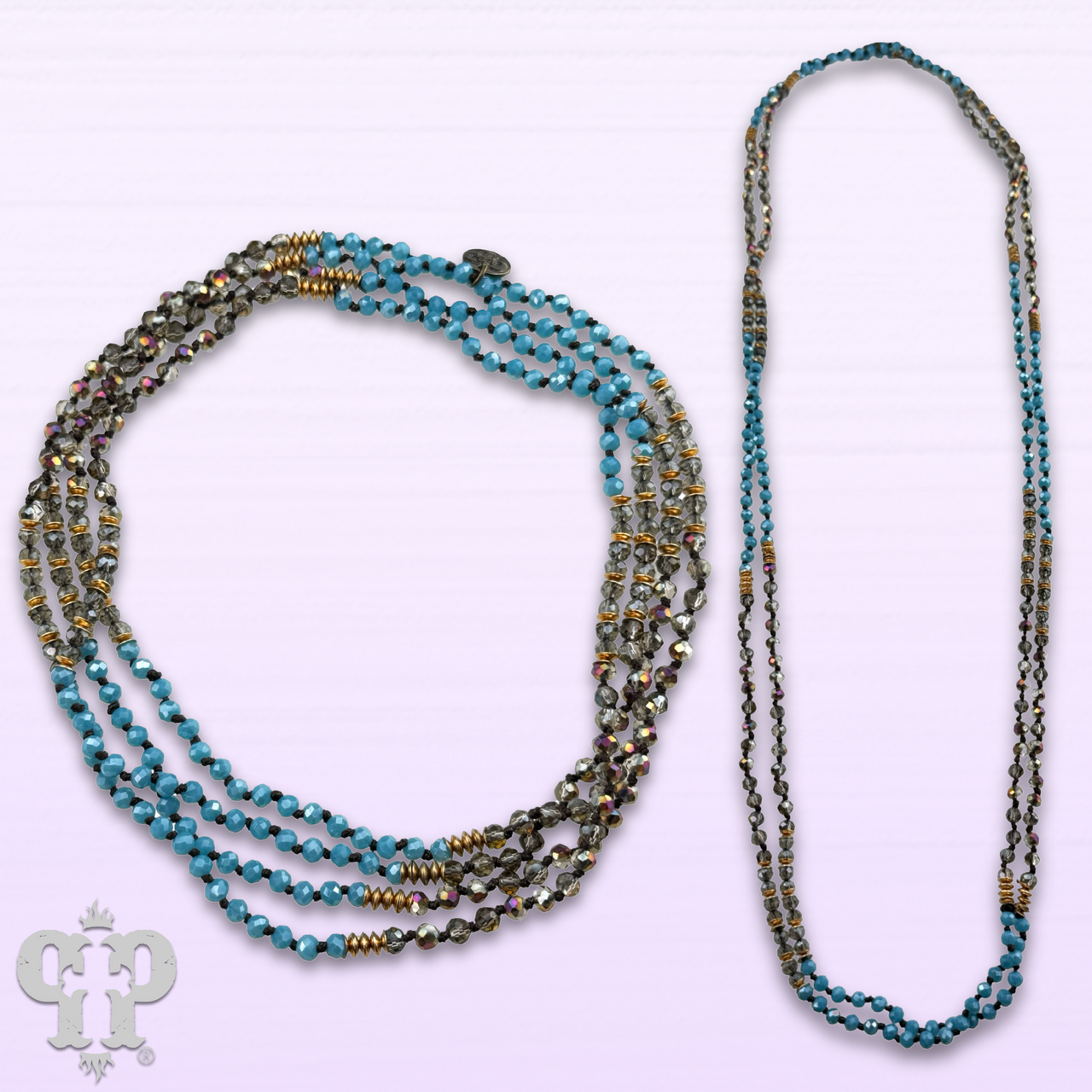 This turquoise blue bead variety crystal knotted necklace is easy to layer or double up since there is no clasp.