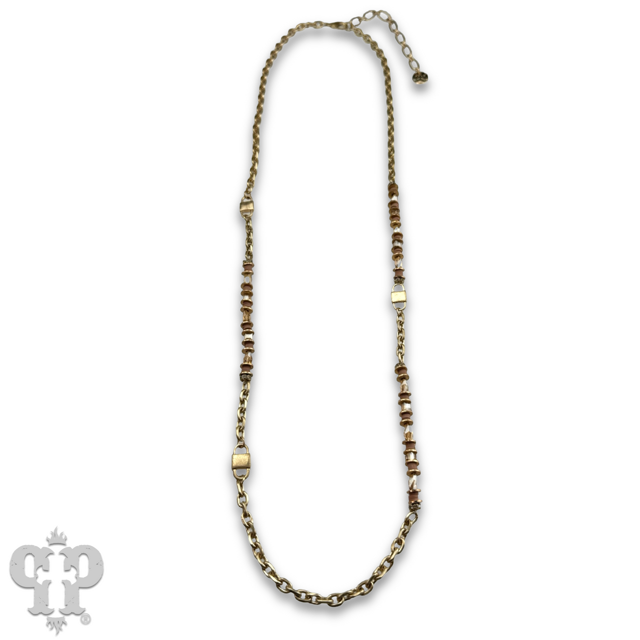 This longer layering necklace has gold tone chain and hardware with champagne crystals and mauve rubber beads.