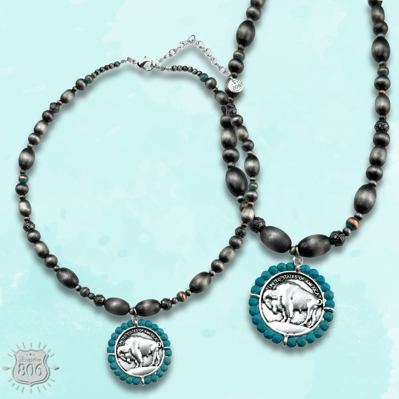 This mixed shape silver beaded necklace has a bead encircled buffalo coin pendant.