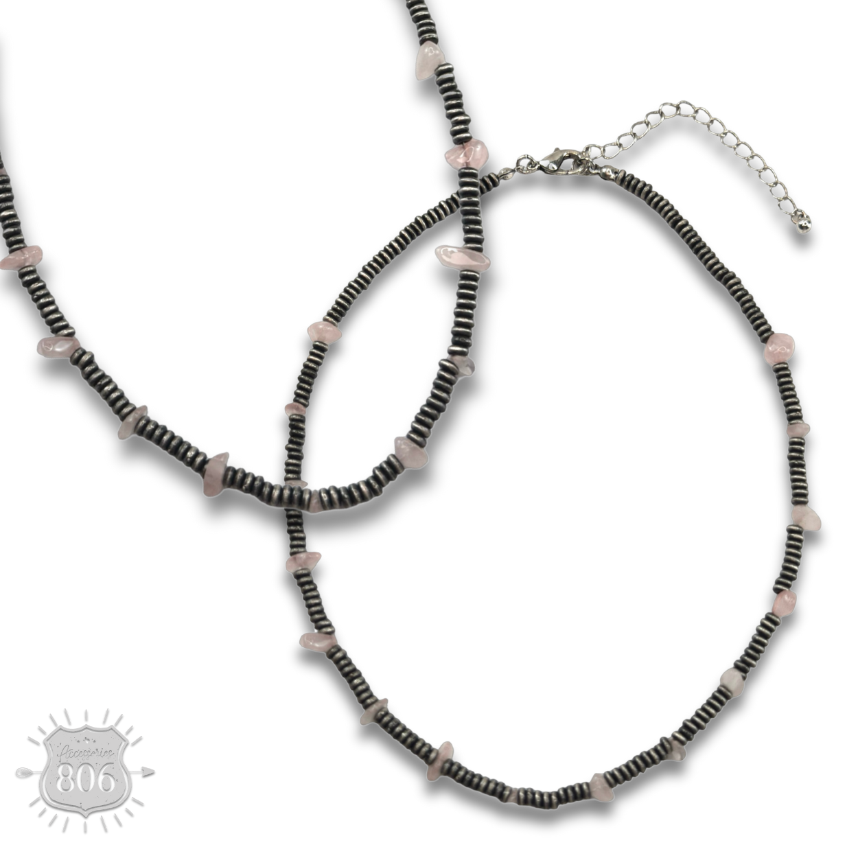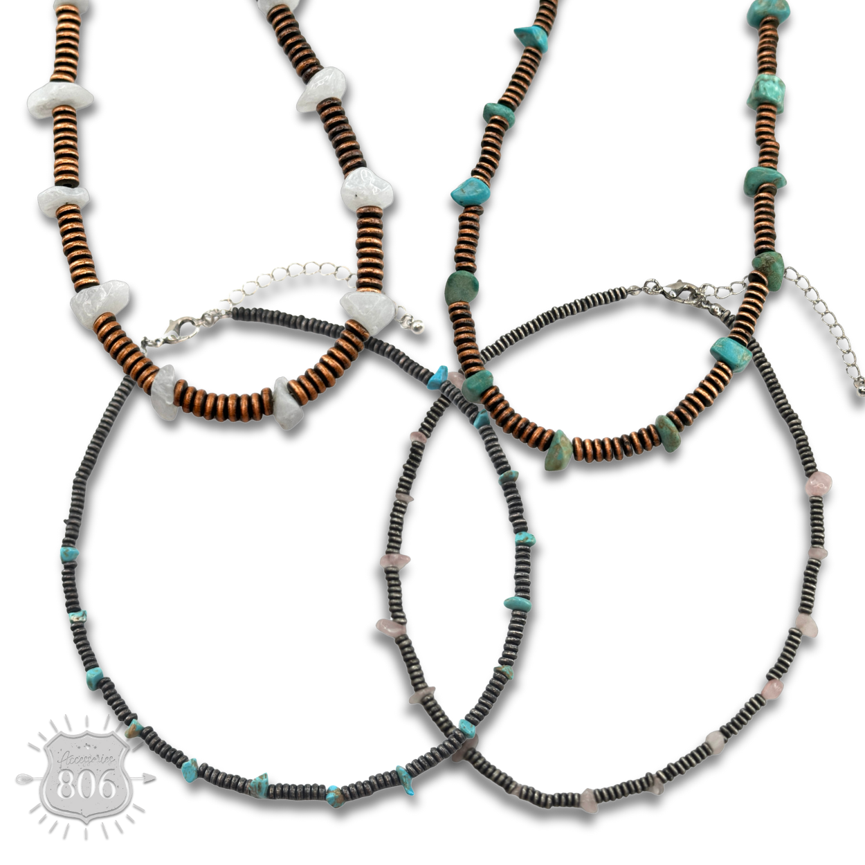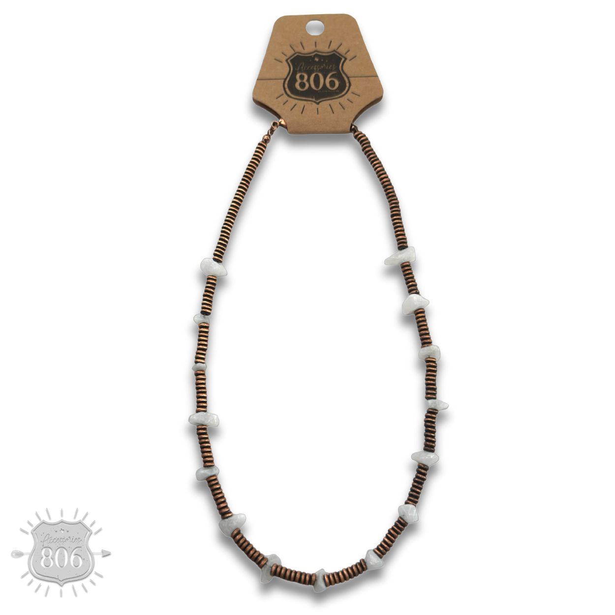 This western style necklace sports small burnished metal saucer and stone chip beads.