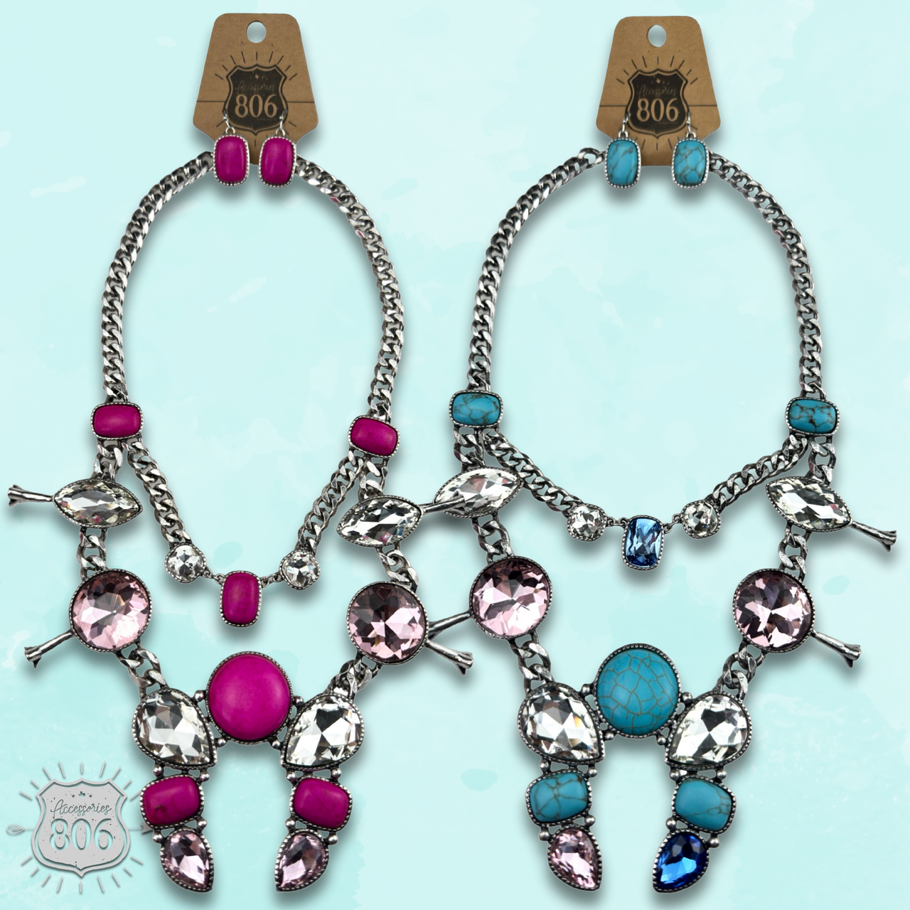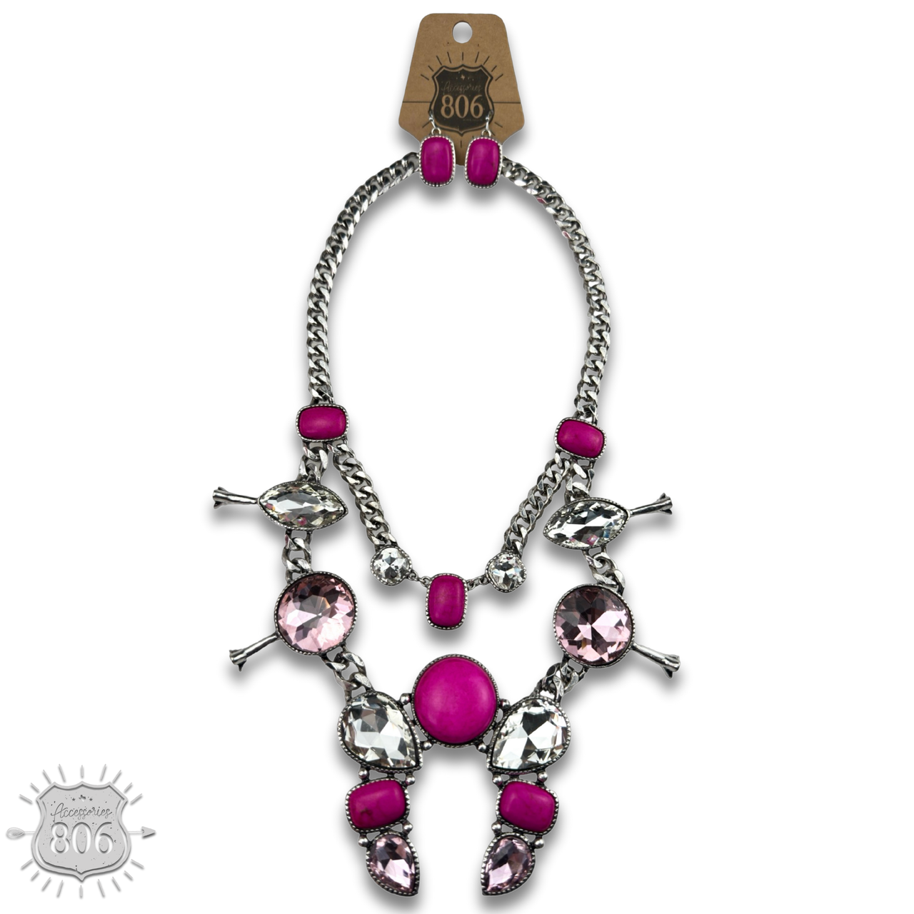 Get ready to rock the wild, wild west with this rad rhinestone squash blossom necklace set! Featuring a stunning layered design, complete with a stone and a splash of sparkle, this necklace is perfectly paired with matching rectangle earrings. Yeehaw!