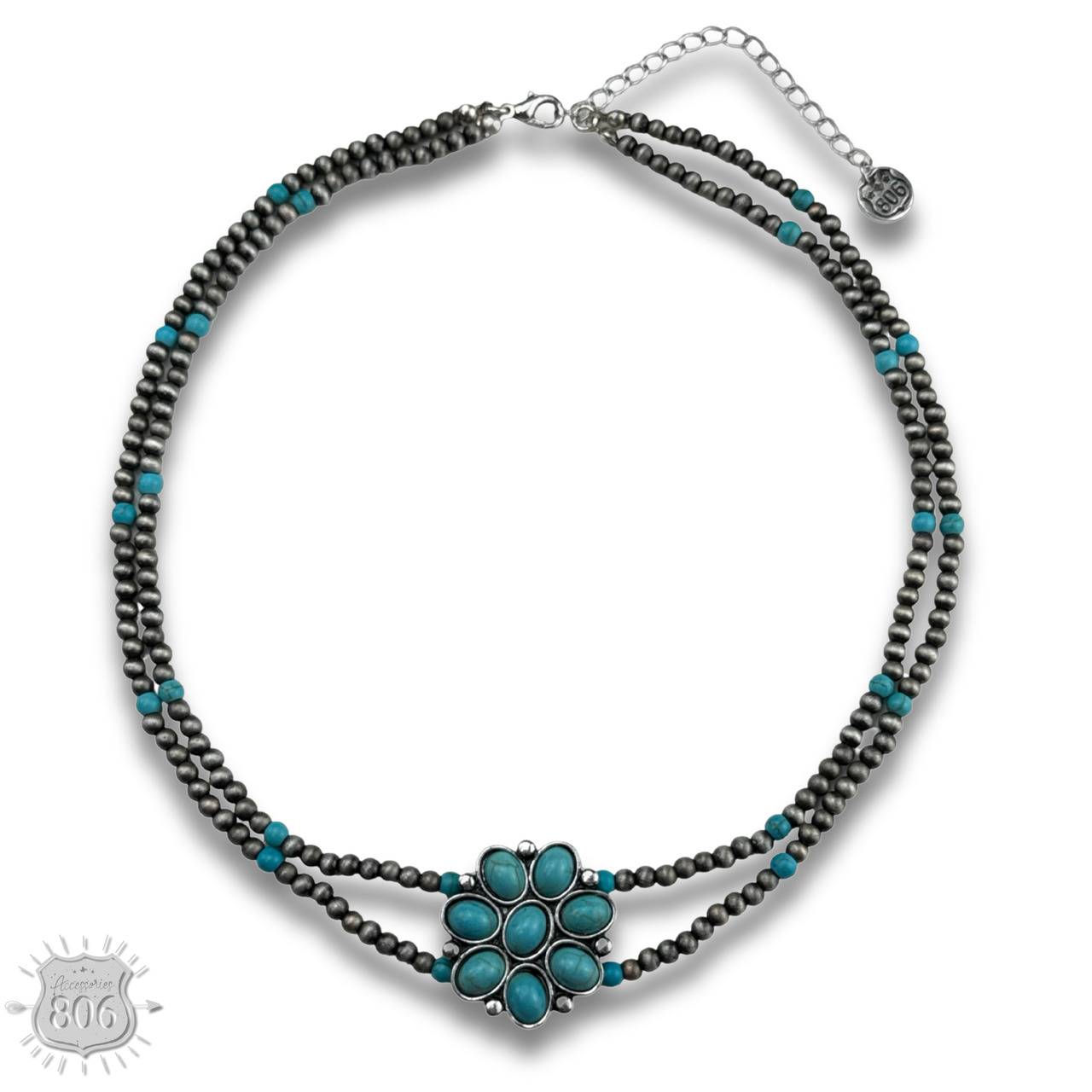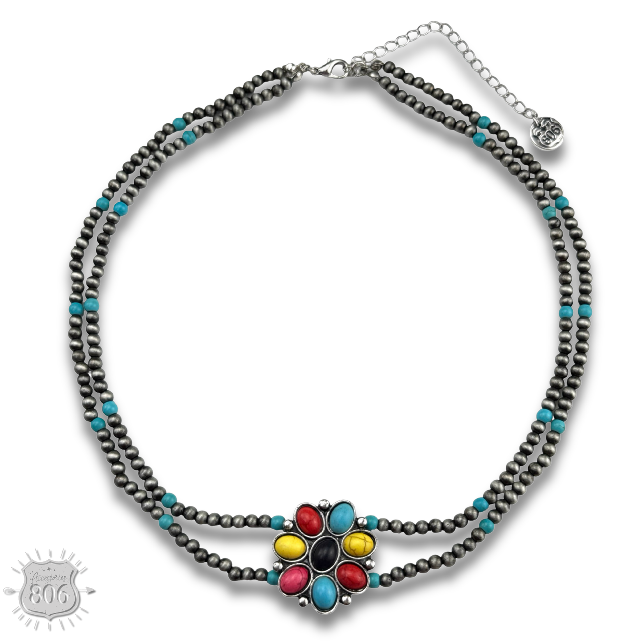 This western style necklace has two silver and turquoise color stone bead strands connected by a stone flower shape pendant.