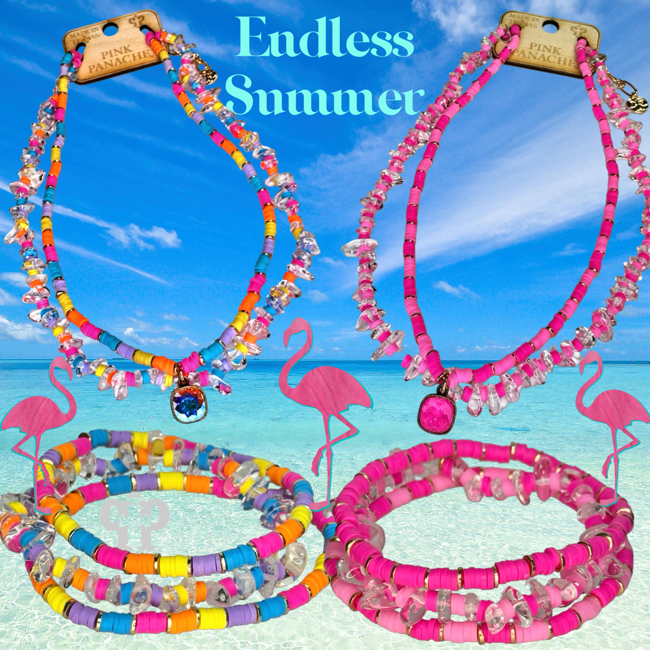 This vibrant necklace features two strands of rubber disc beads and acrylic chip beads. The pendant is a 10mm Austrian crystal drop in a setting custom made for Pink Panache in the USA.
