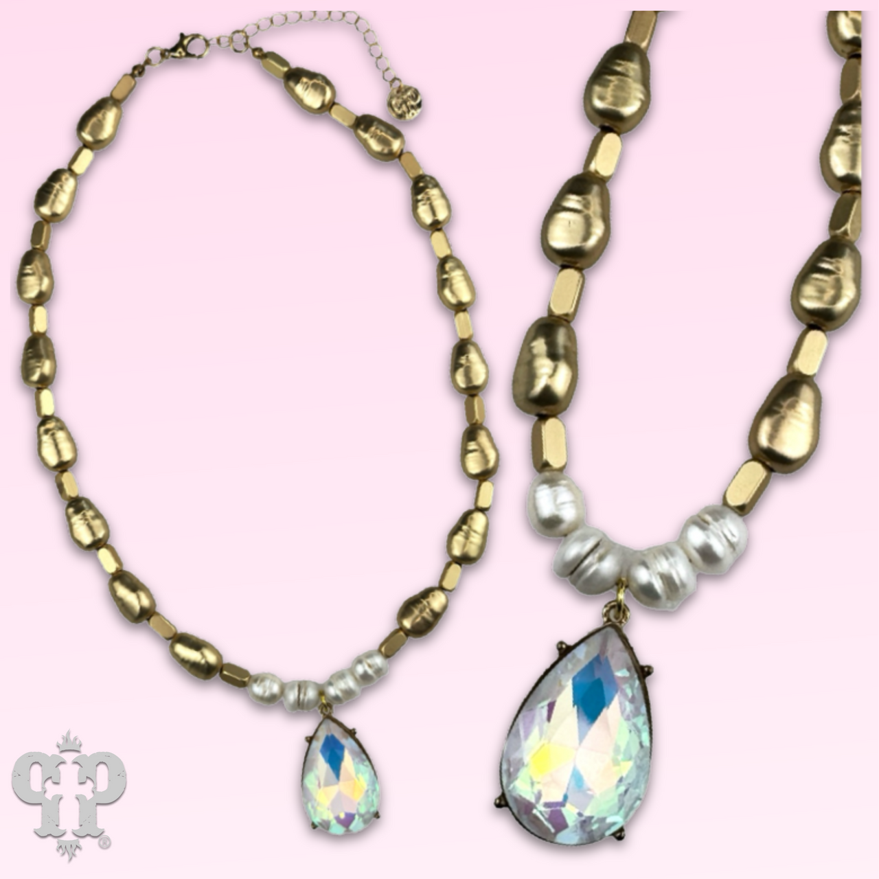 This necklace boasts of shimmery gold beads and lustrous pearls, while the pendant is a stunning white opal rhinestone in the shape of a teardrop.