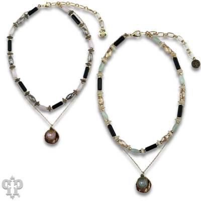 The feature strand of this choker length necklace has a mix of smooth, faceted, opaque and clear beads. The gold tone accent chain sports a pendant with a gold tone disc and 10mm Austrian crystal in a setting custom made for Pink Panache in the USA.
