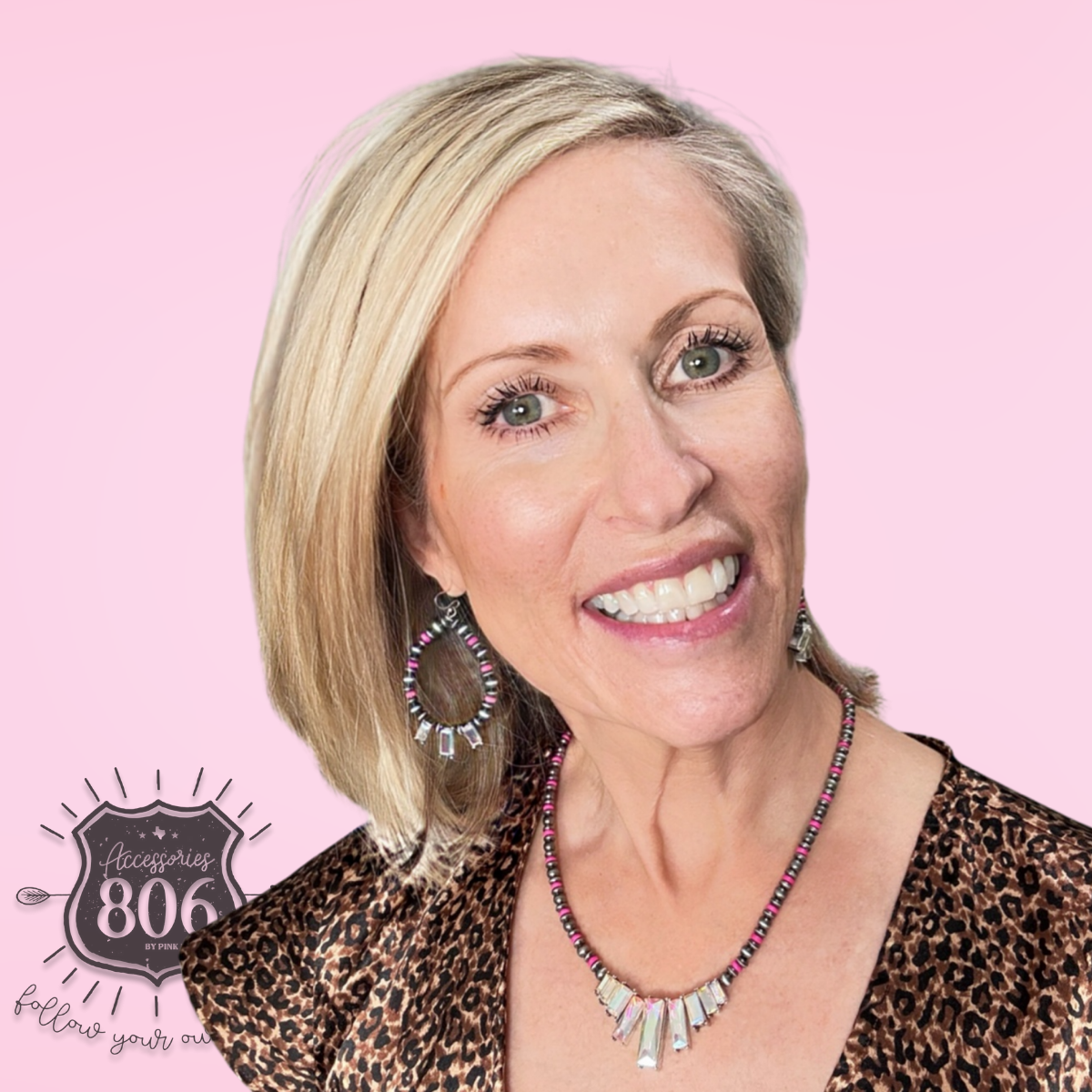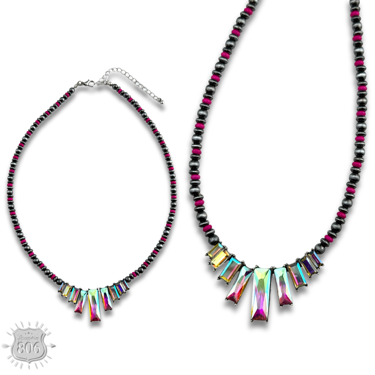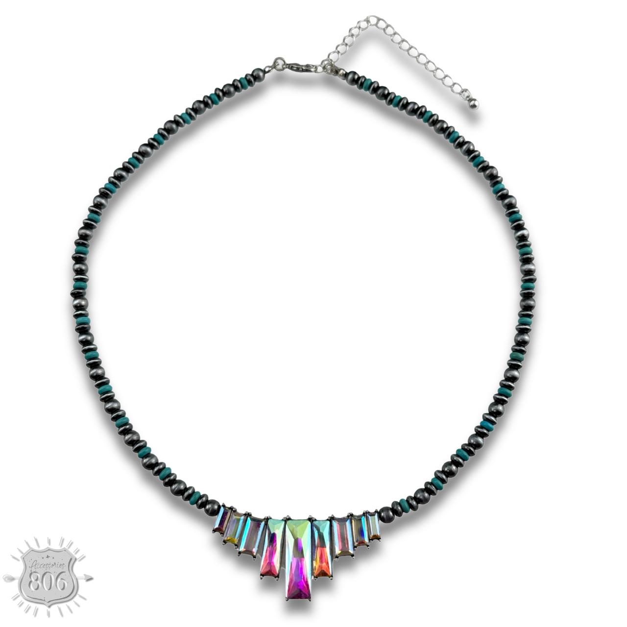 Western style stone disc and silver burnished bead necklace features rectangle rhinestones of varying sizes.