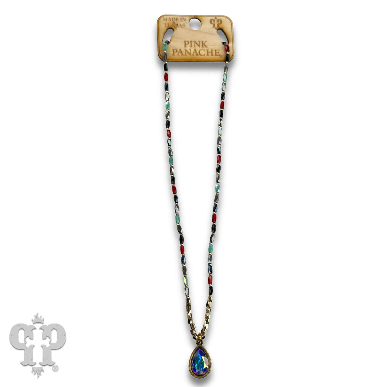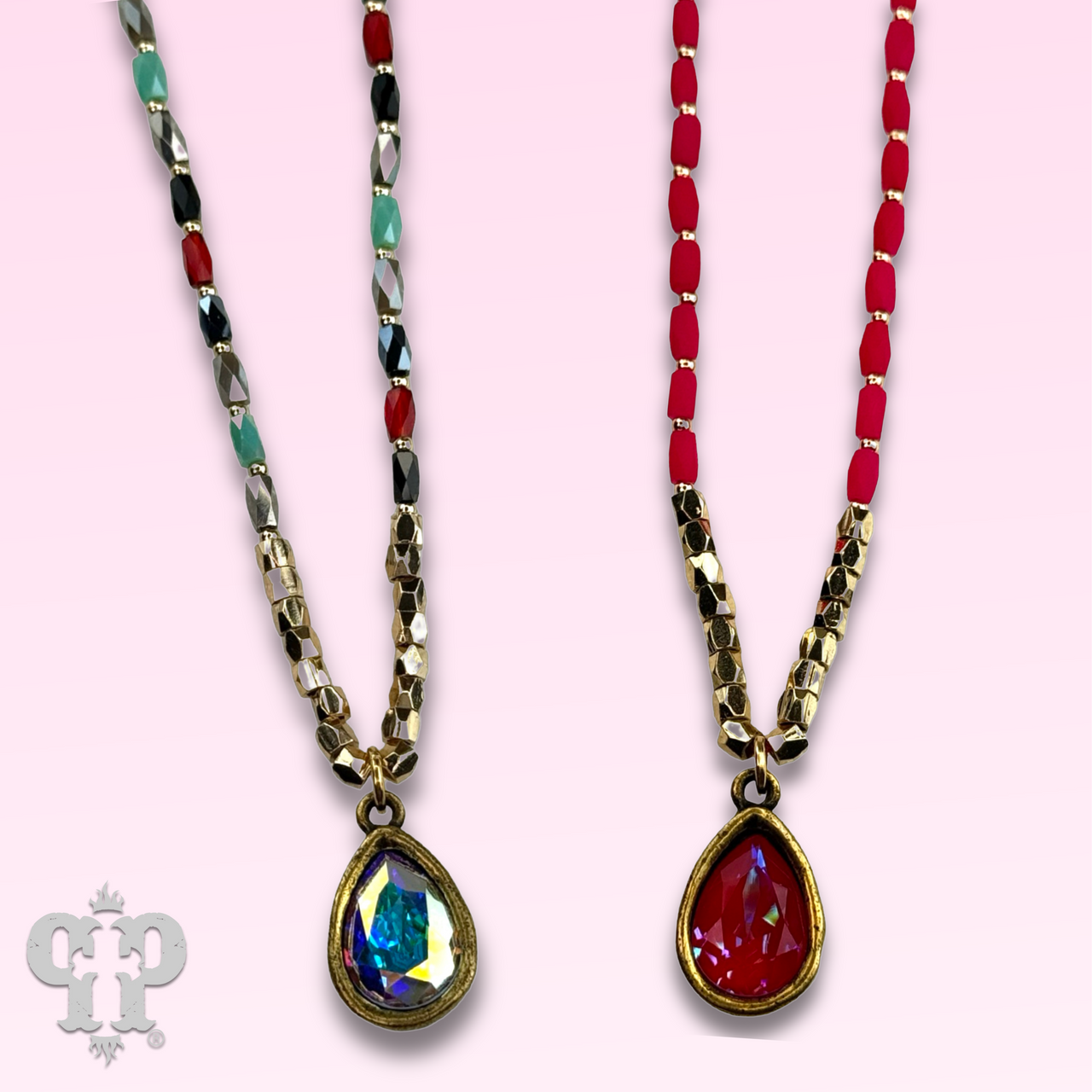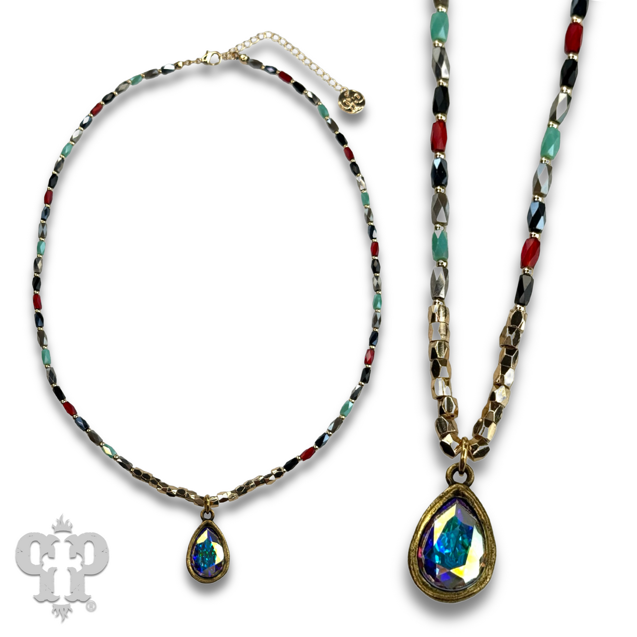This necklace has rice beads with some gold tone ones mixed in. Hanging from the pendant is a shimmering teardrop shape Austrian crystal.