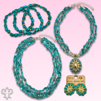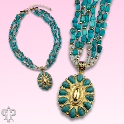 This necklace has three strands of Turquoise and 18k gold dipped saucer beads of varying sizes. It is strung on thread giving it a soft feel. The 18k gold dipped concho has Turquoise teardrop cabochons and is on a decorative bale. It has a lobster clasp and 3" extender chain.