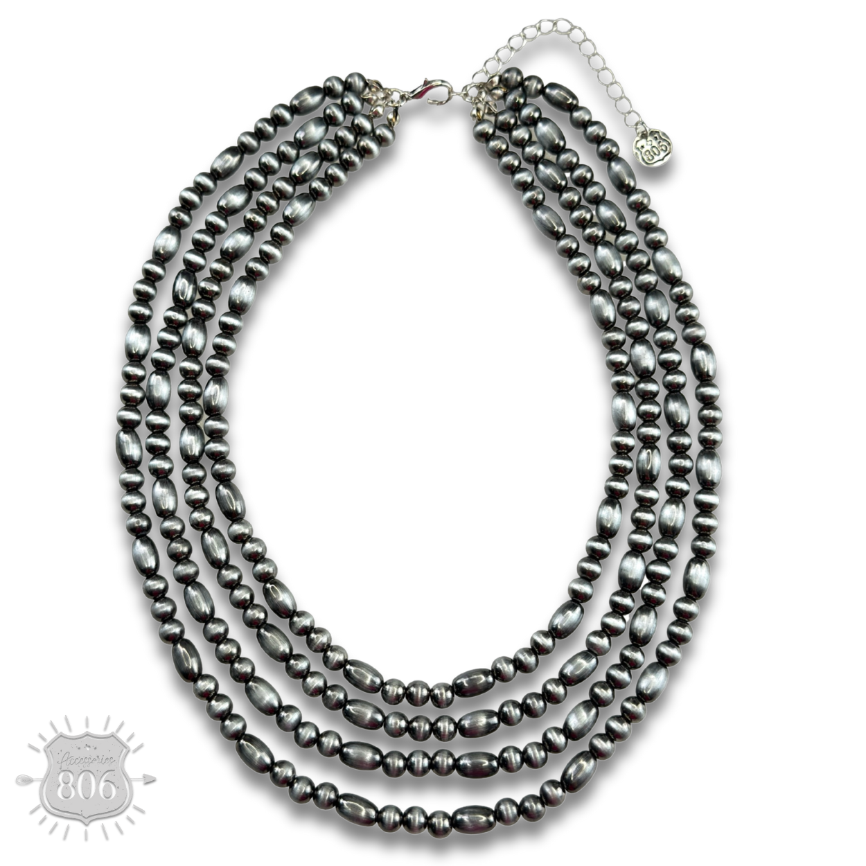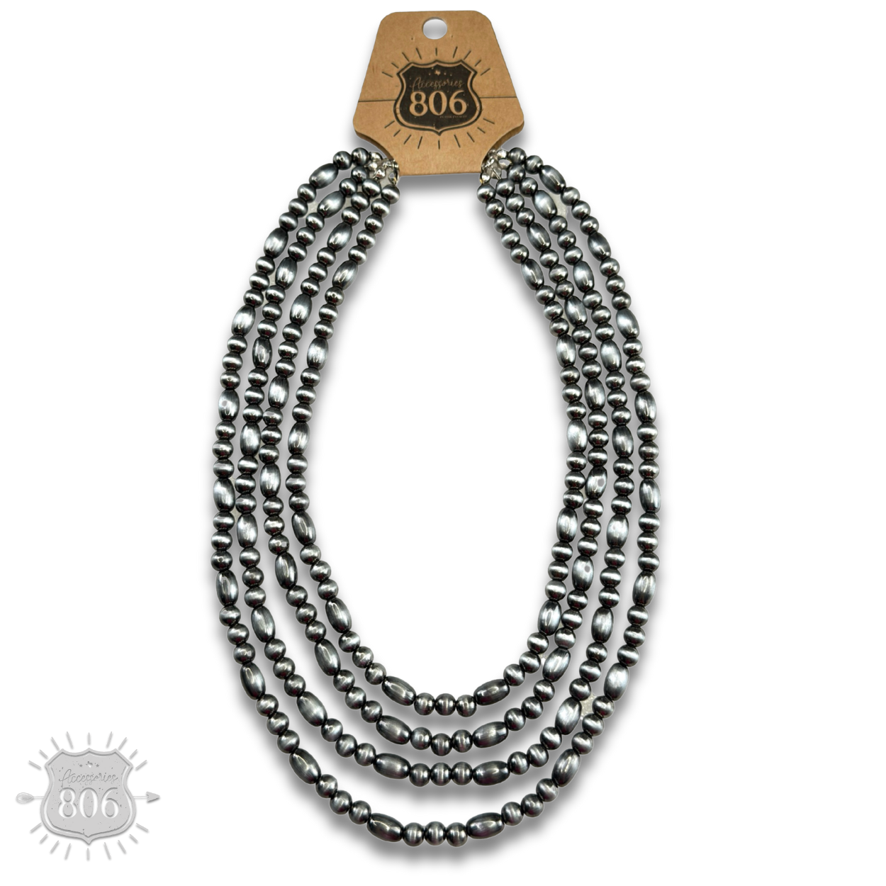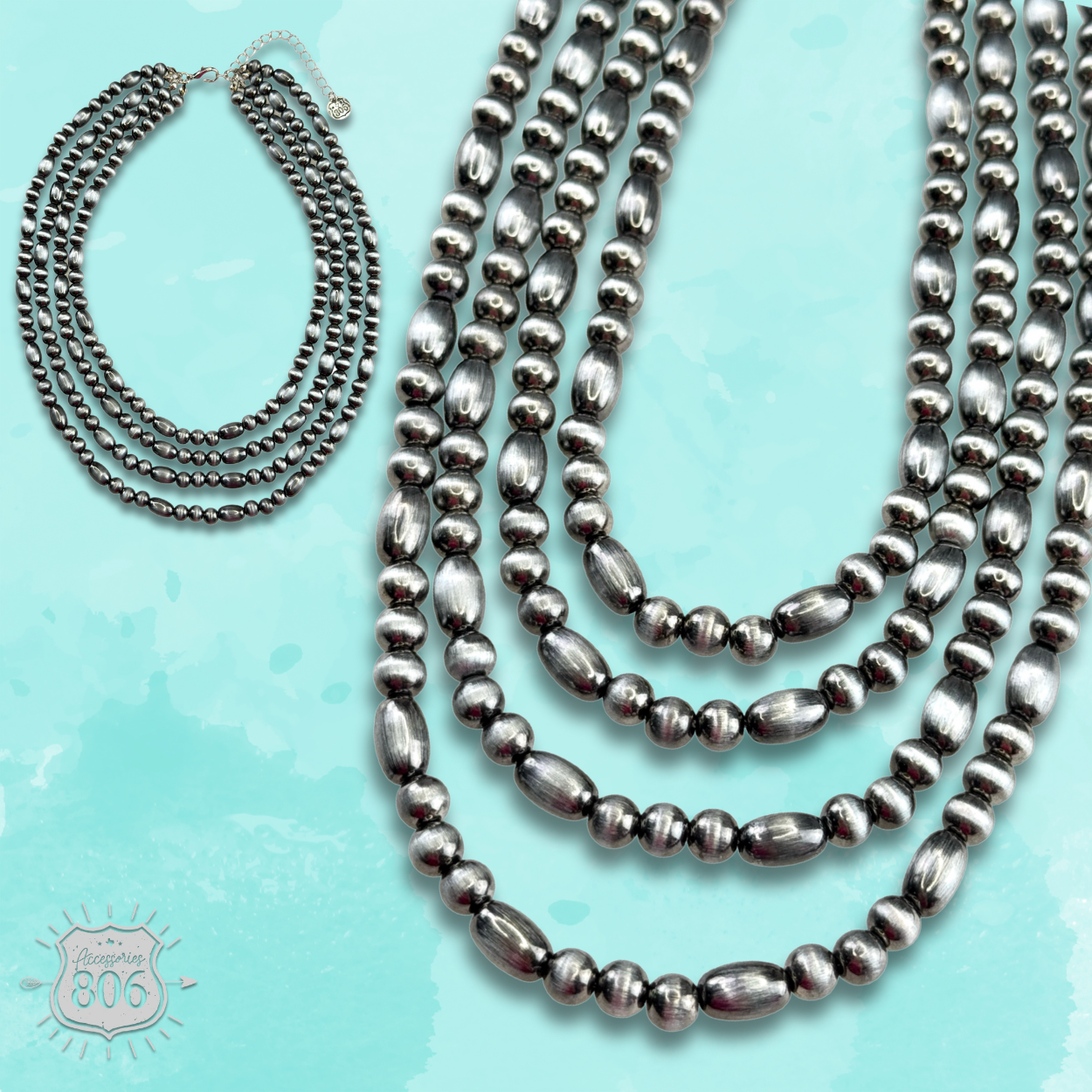 This western style necklace has four strands of mixed shape burnished silver tone beads.  The strands are graduated for the perfect layered look.