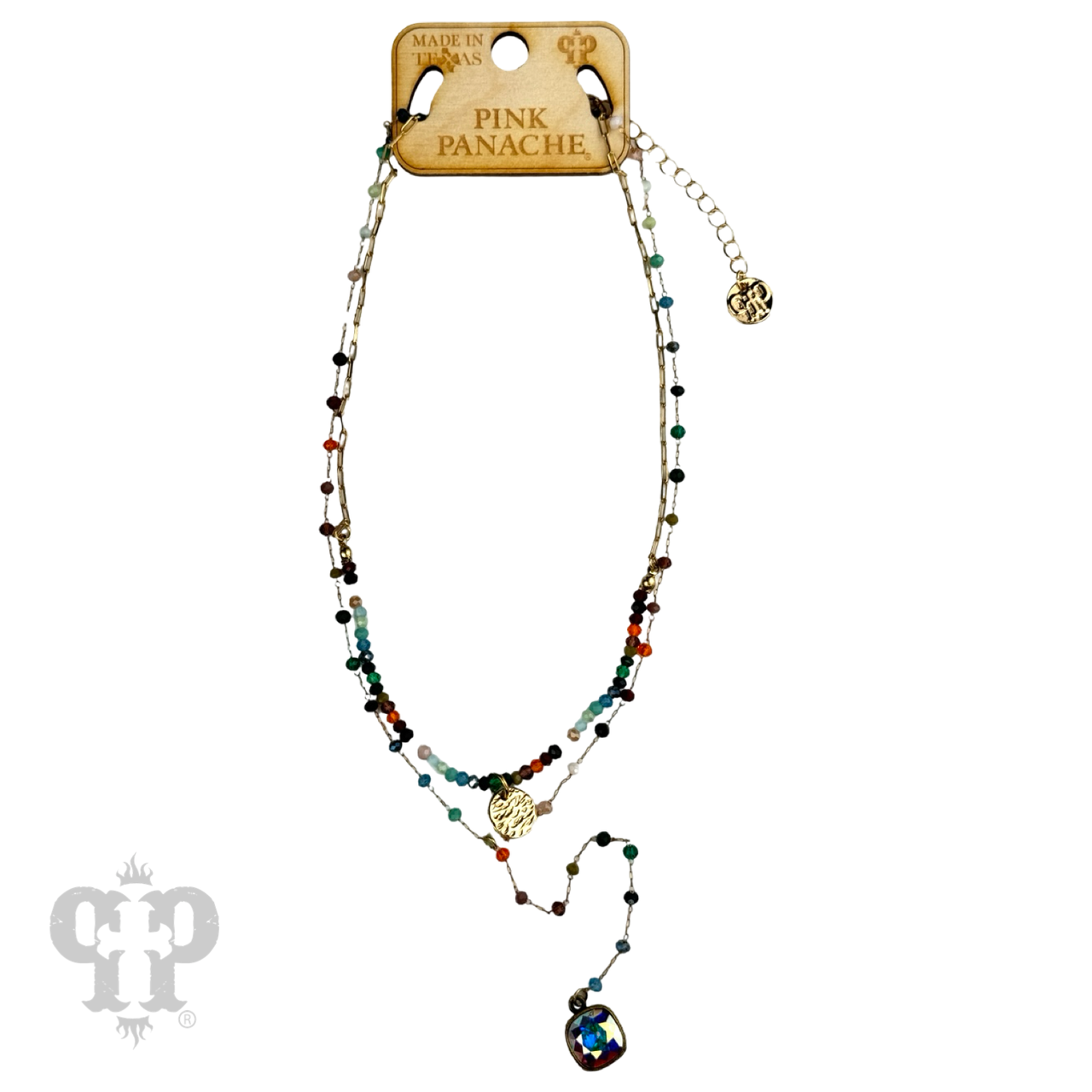 This necklace has two strands; one has wire wrapped linked faceted beads and the other is half chain, half bead.  A 10mm Austrian crystal pendant drop is in a setting custom made for Pink Panache in the USA.