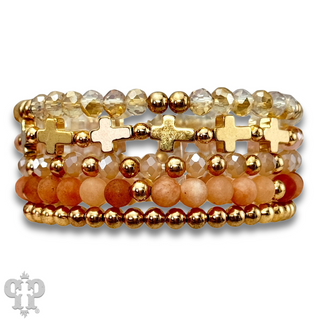 Five strand stone and gold cross bracelet set