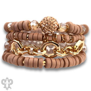 Large wood and foil texture bead bracelet stack with rhinestone charm - LC