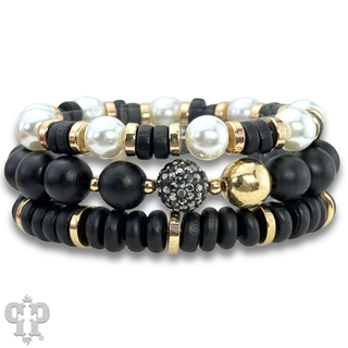 Wood and gold bead bracelet set with Austrian crystal
