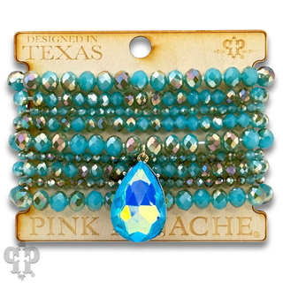 Faceted bead nine strand bracelet set, rhinestone teardrop charm