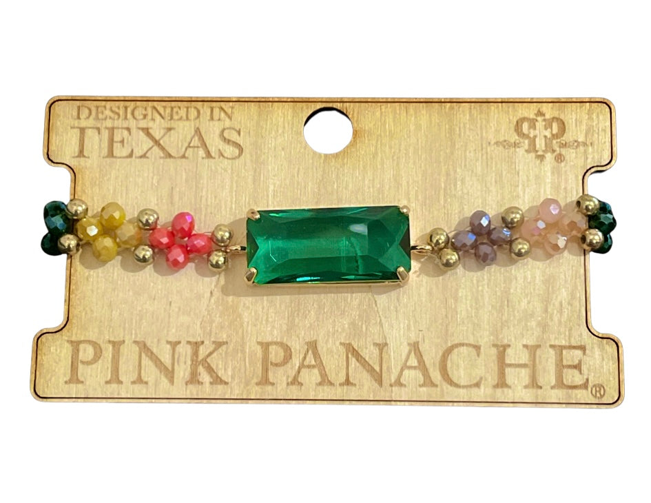 This single strand bracelet has multi-color beads in a flowere shape. In the center is an emerald rhinestone rectangle charm. Stretches for ease of wear. One size fits most.