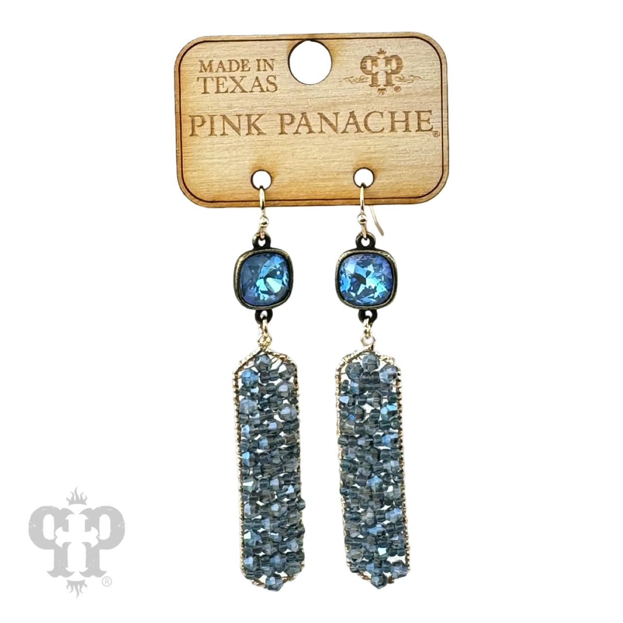 These hexagon shape earrings have faceted bicone and seed beads wire wrapped onto a gold tone base. The earrings hang from a 10mm Austrian crystal connector setting custom made for Pink Panache in the USA.