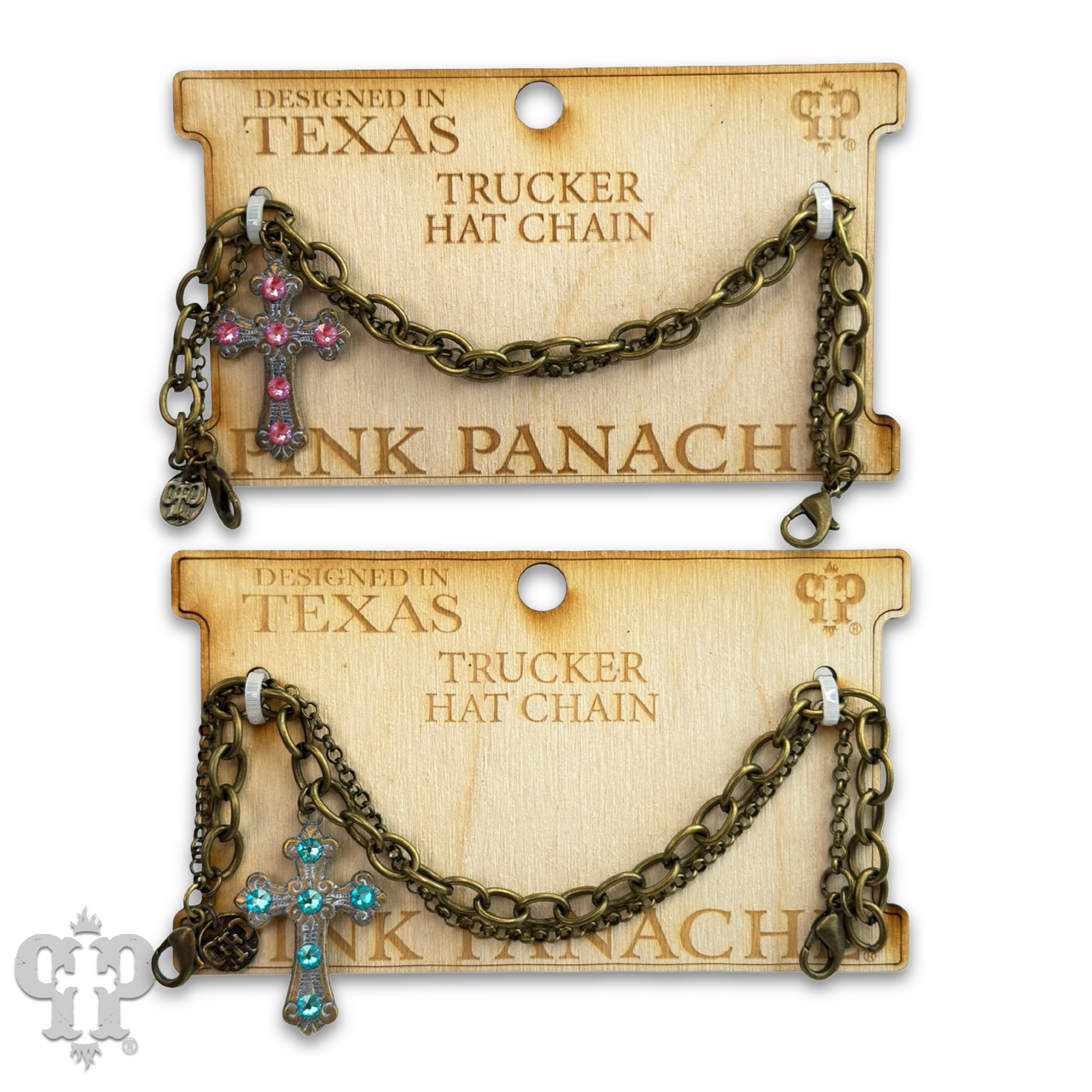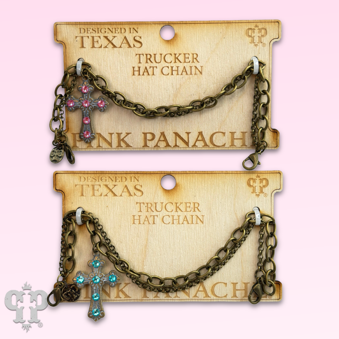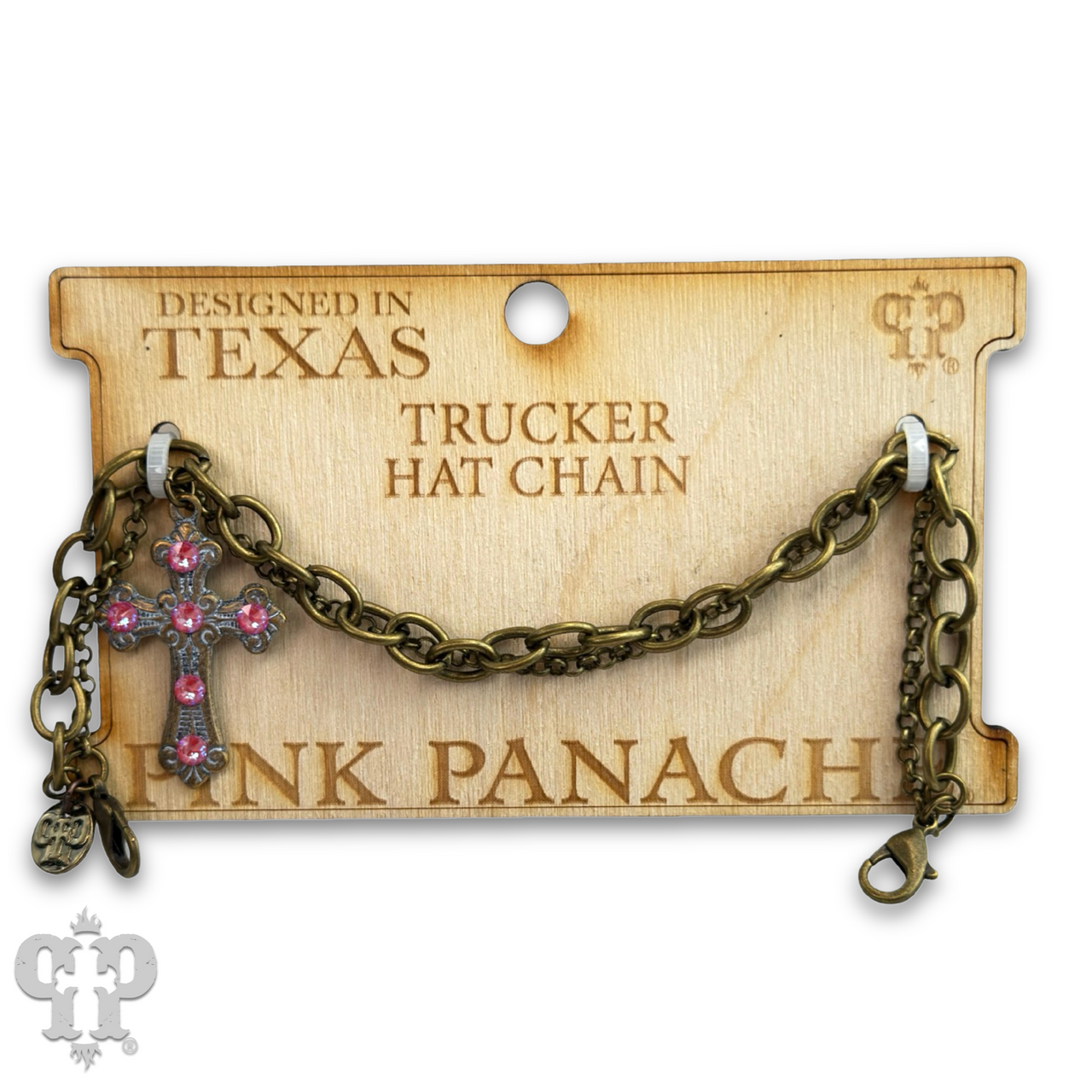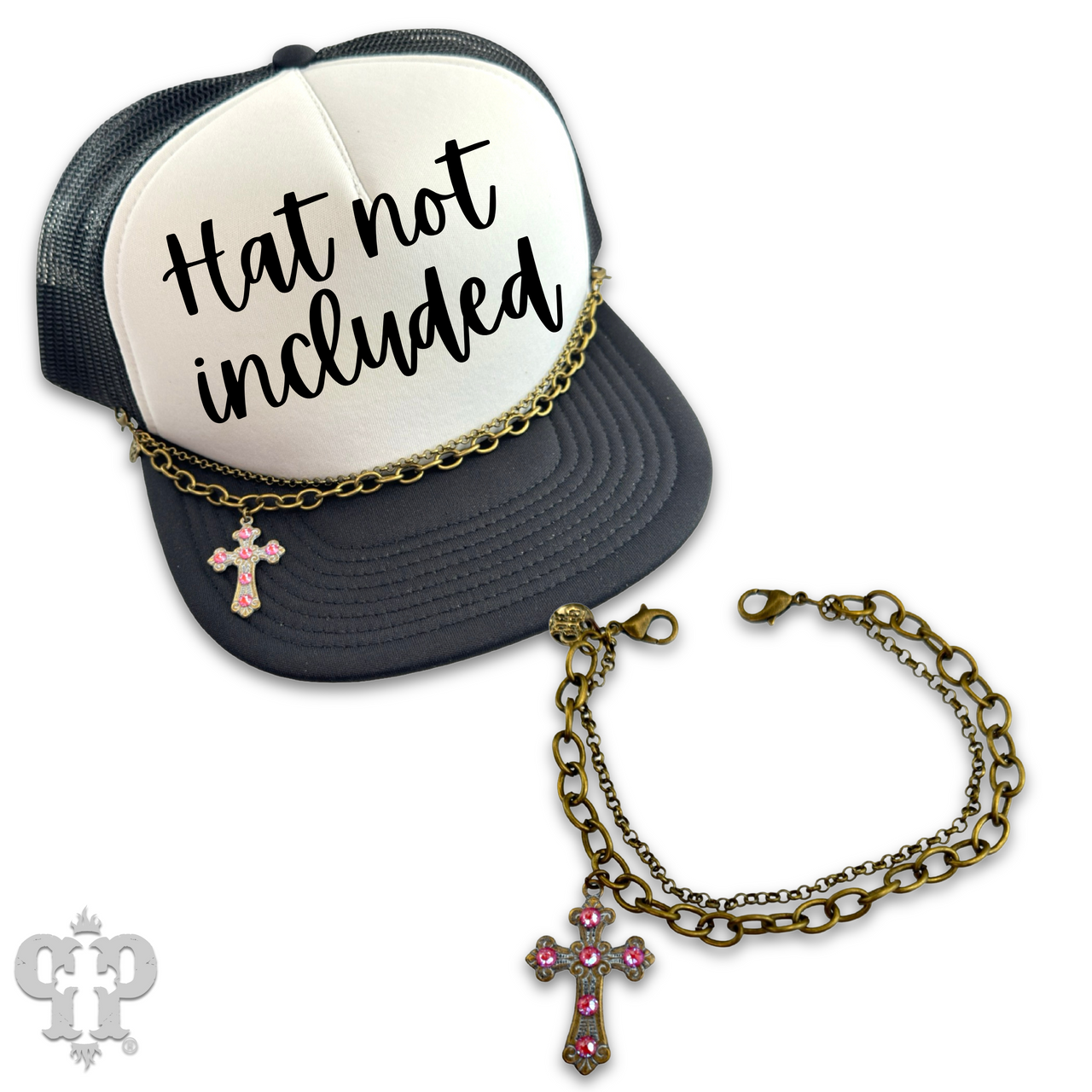 This trucker hat chain has two strands of bronze color chain. The charm is a plated brass cross with hand set Austrian crystals.  It has lobster clasps on either side to hook onto a cap.