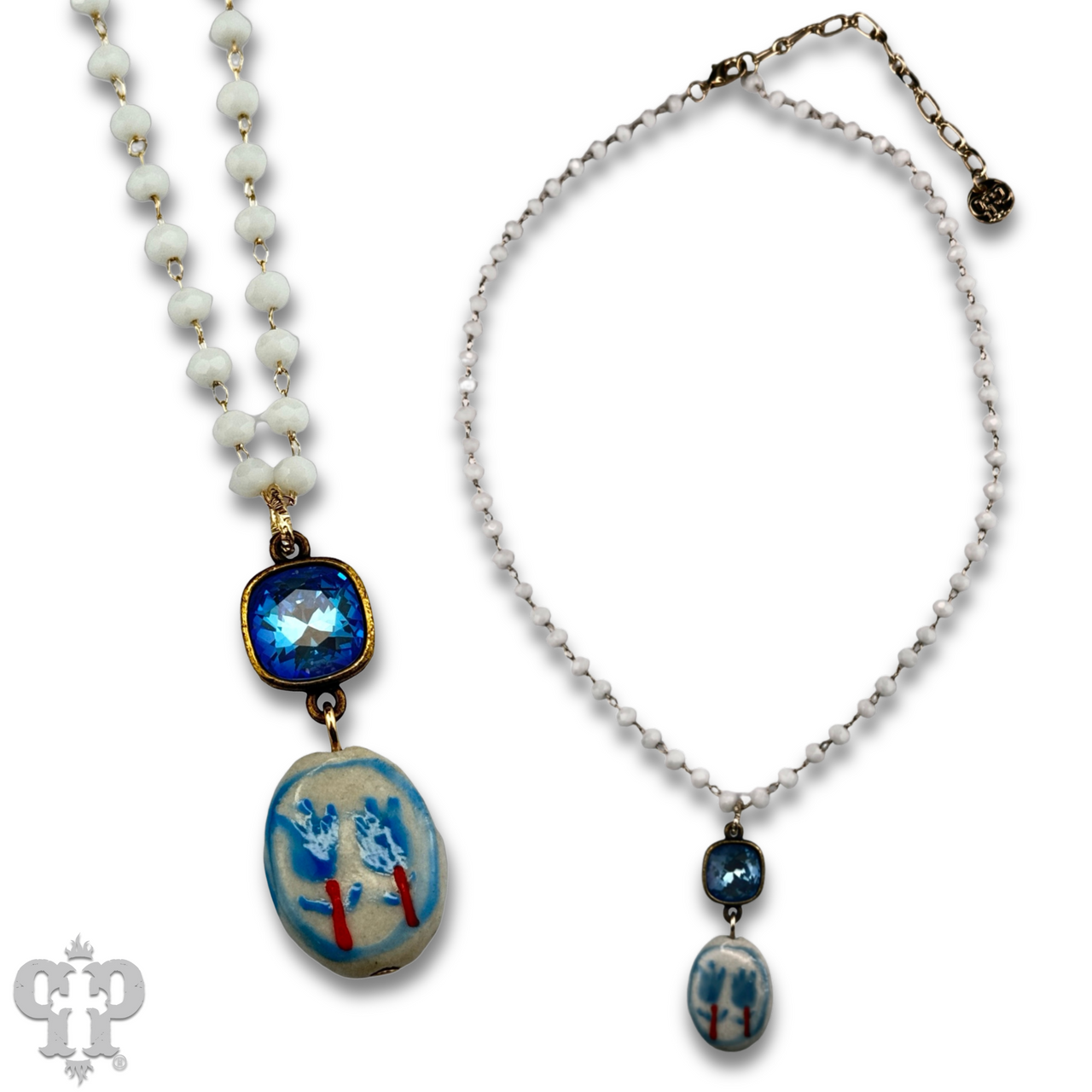 This necklace has linked faceted glass beads with a ceramic charm pendant with painted tulip flowers on them. Between the necklace and charm is a 10mm Austrian crystal in a setting custom made for Pink Panache in the USA. It measures approximately 16 inches with an extender chain.