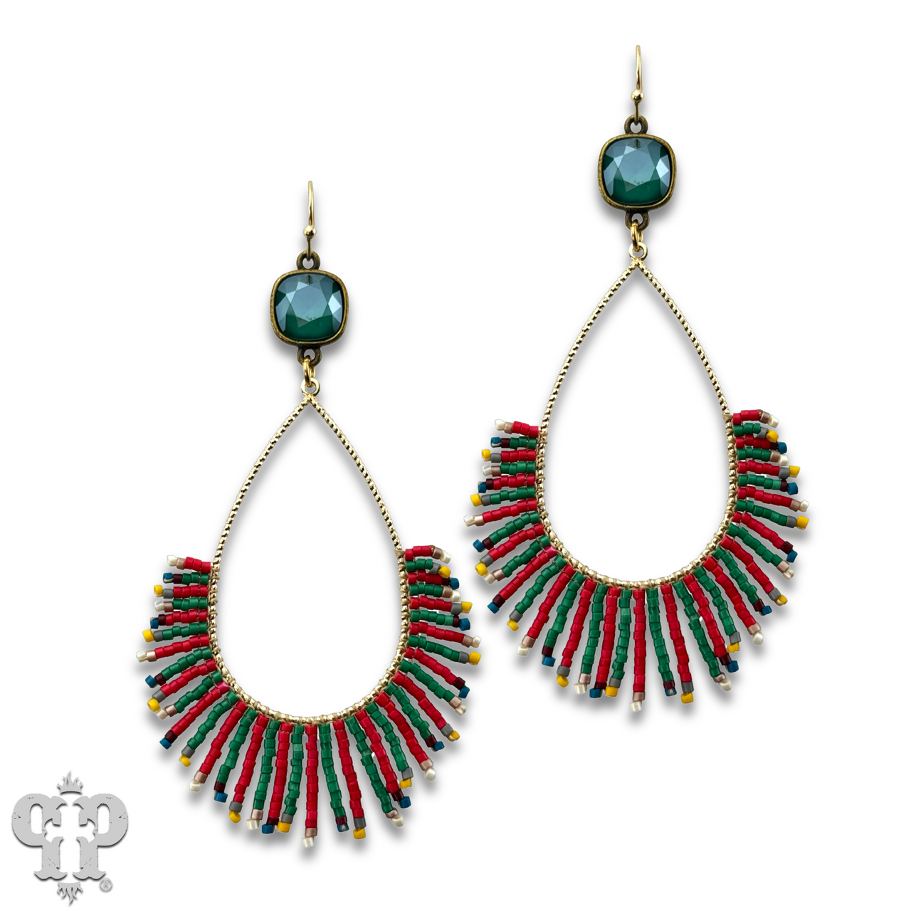 This earring has a gold tone teardrop with red and green bead fringe along the bottom. It hangs from a 10mm royal green Austrian crystal in a setting custom made for Pink Panache in the USA.