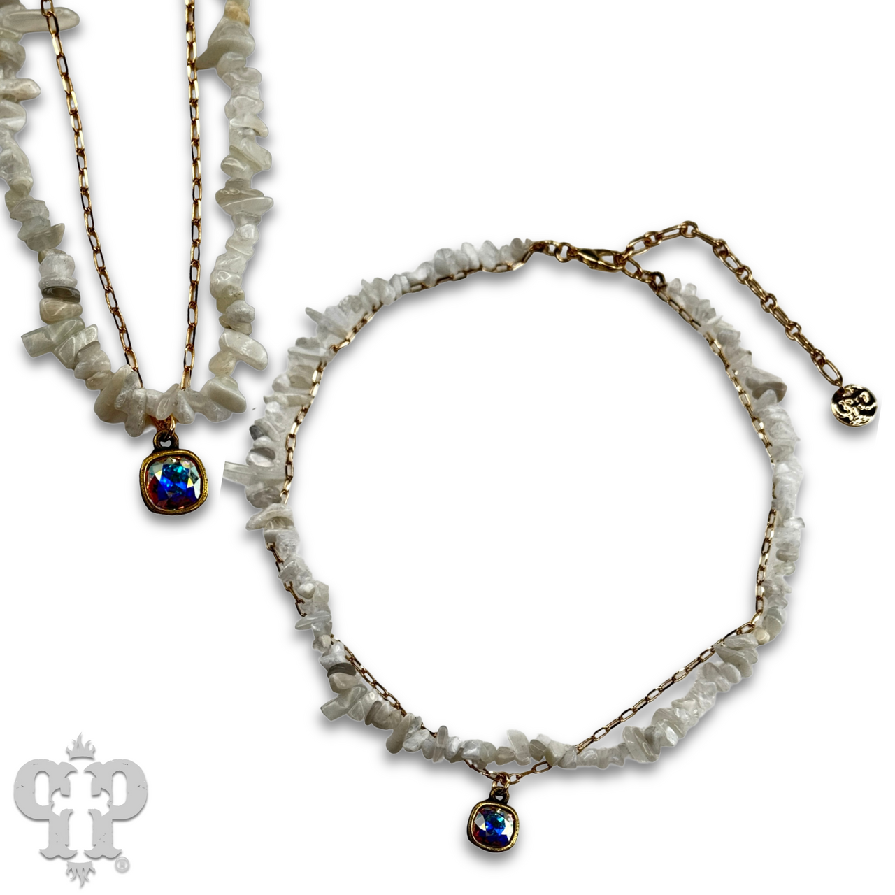 This necklace has a strand of stone chip beads and one of gold tone paperclip chain. A sparkling Austrian crystal hangs from the chain. It boasts a great layered look.