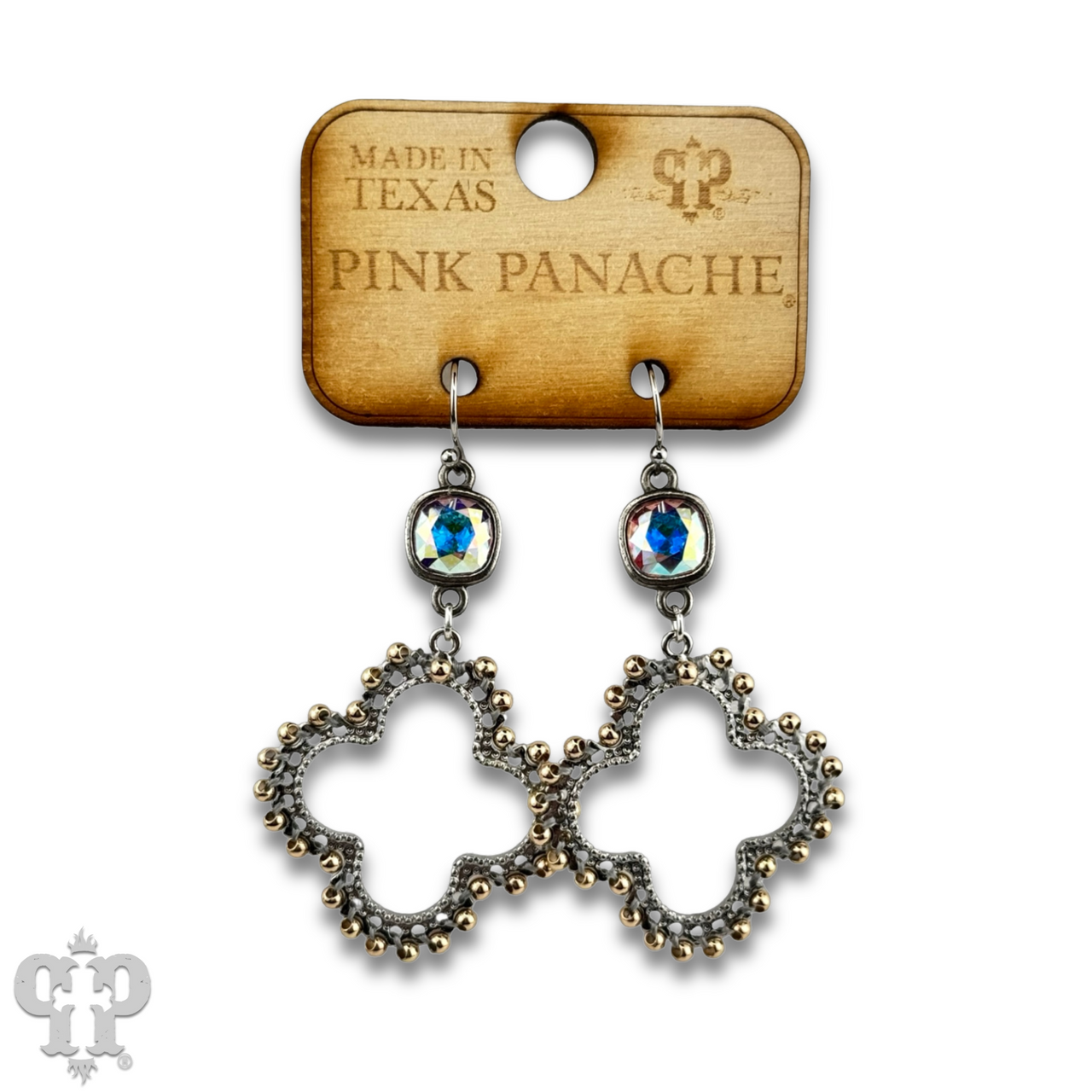 These gold and silver tone earrings are in the shape of a clover cross and hang from an 8mm iridescent (AB) crystal in a setting custom made for Pink Panache in the USA.