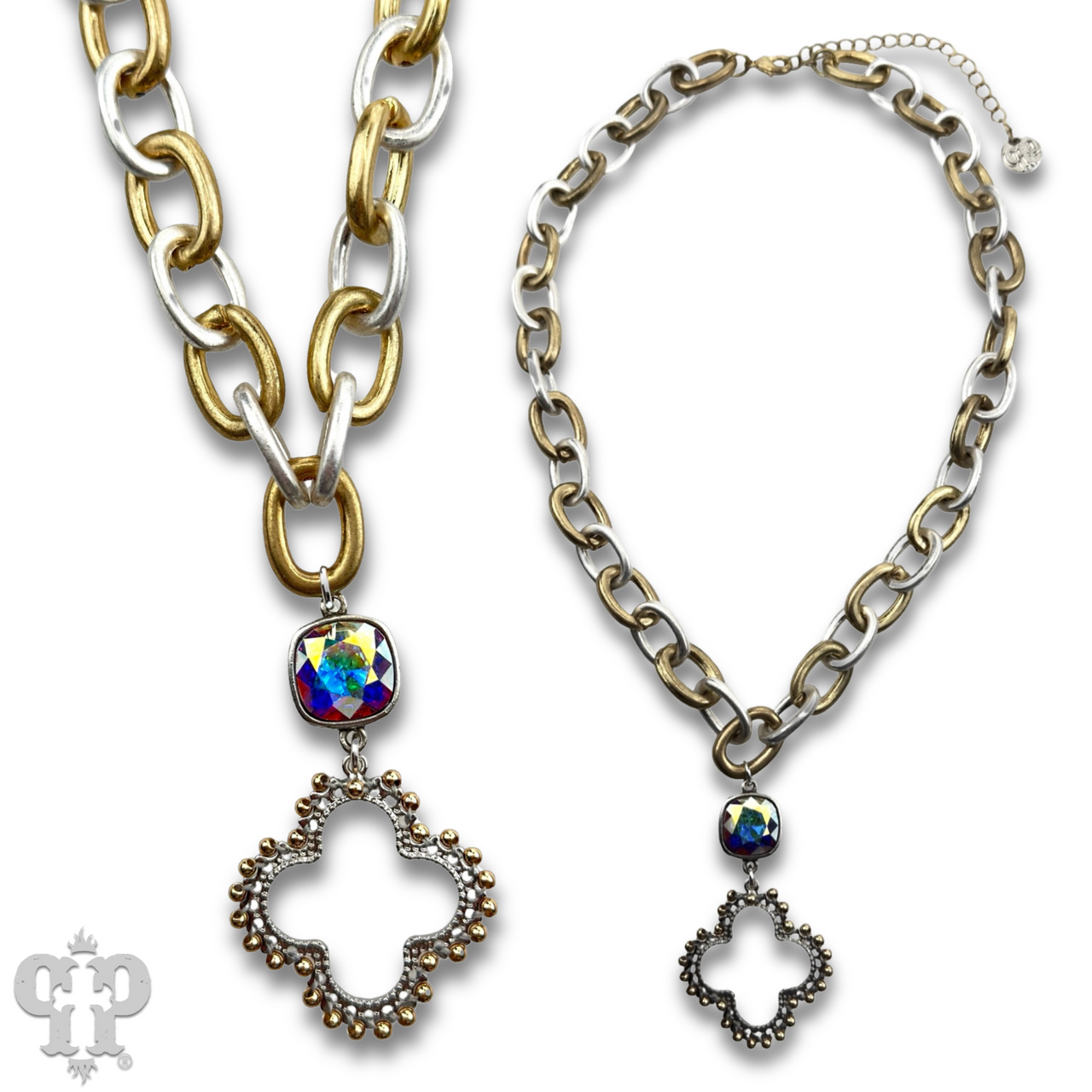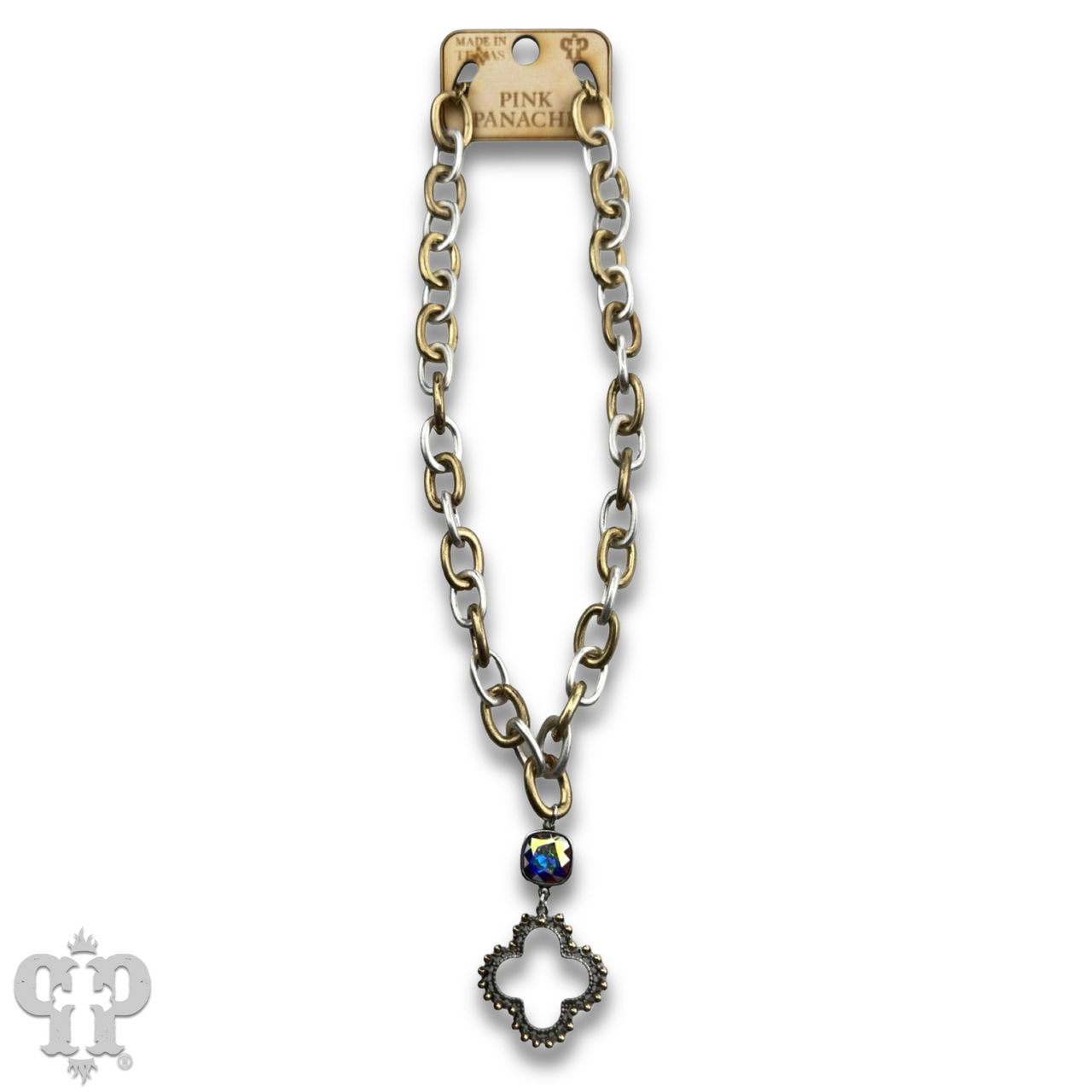 This necklace has a large oval link two tone chain and clover shape cross charm. The charm hangs from a 12mm iridescent (AB) crystal in a setting custom made for Pink Panache in the USA. It measures approximately 16 inches and has an extender chain.