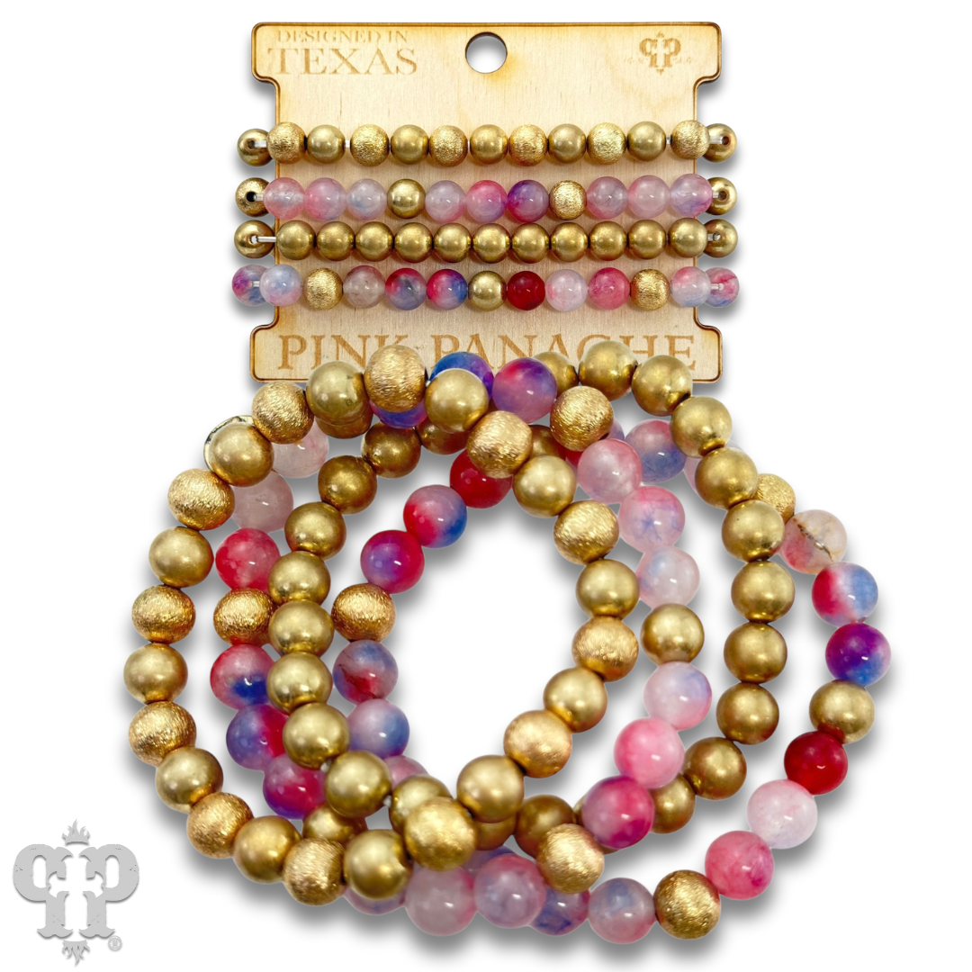 This bracelet set features a unique mix of dyed stone and gold tone beads, playfully mixed into four strands. It stretches for effortless wearability.