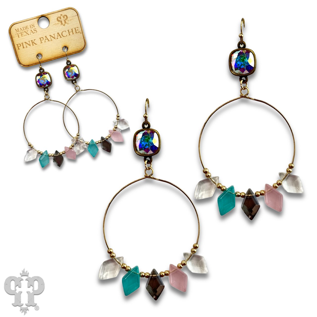 These earrings have playful diamond shape beads along the bottom of a circle. They hang from an Austrian crystal.