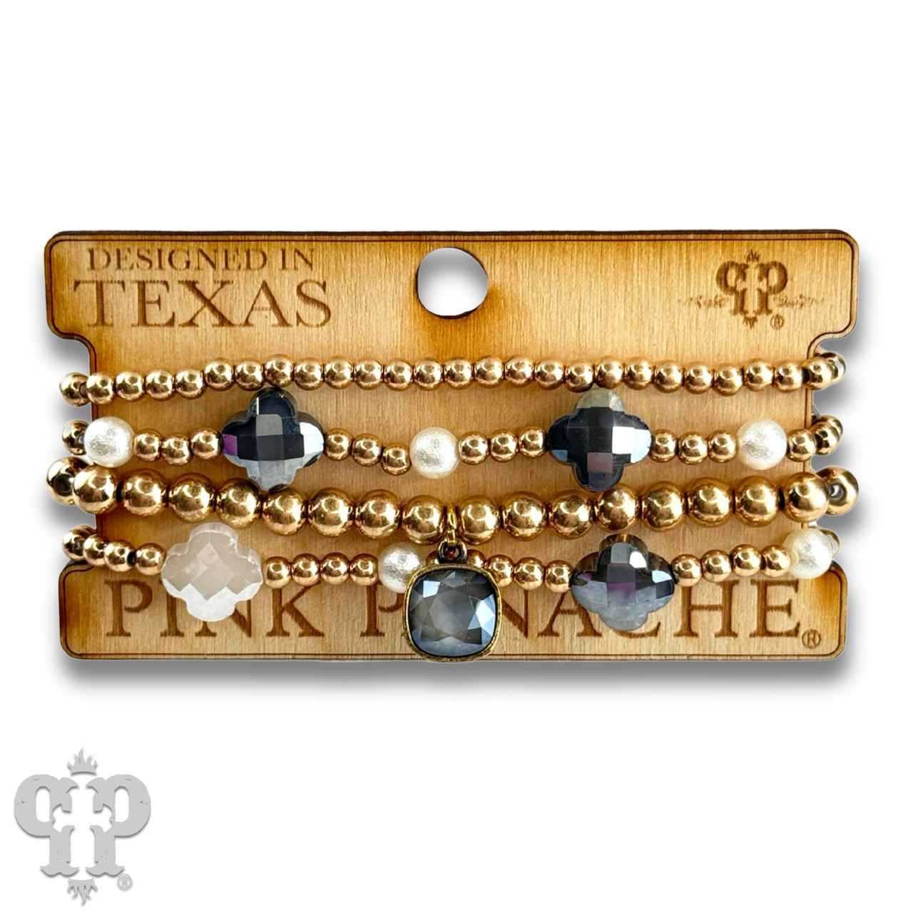 This bracelet has four strands of gold tone round beads with faceted clover shaped beads mixed in. The bracelet features a sparkling Austrian crystal and stretches for ease of wear.