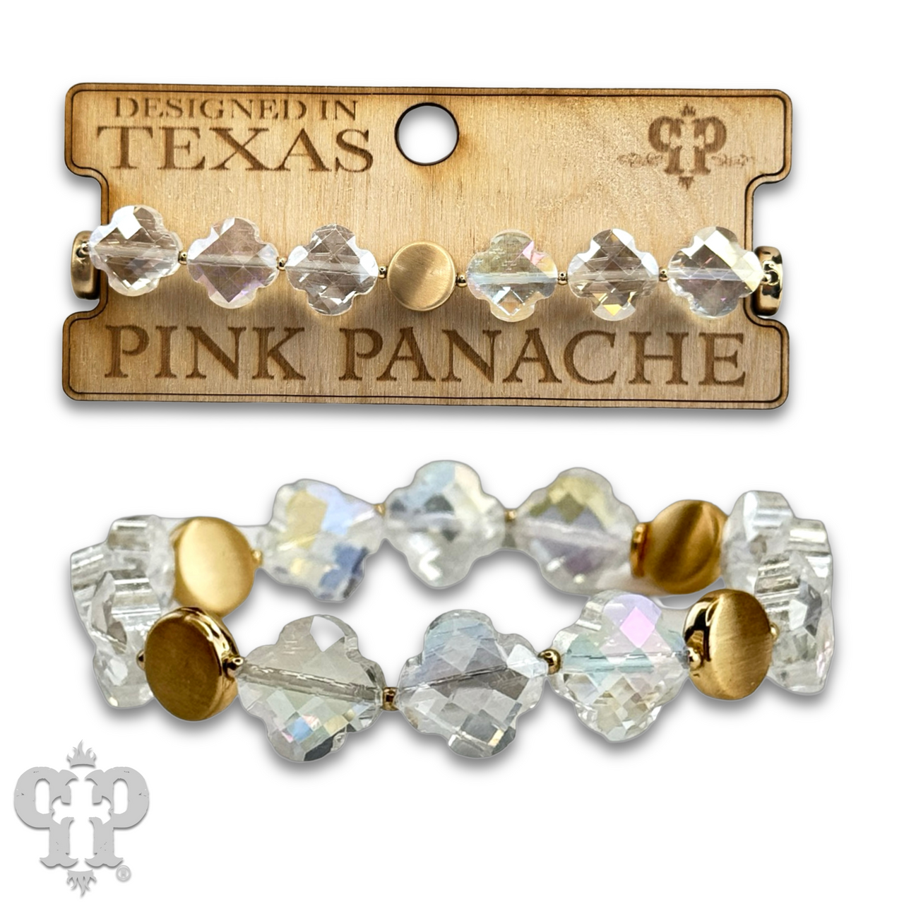 This single strand bracelet has faceted clover shaped glass beads. In the center is a brushed finish gold tone oval bead.